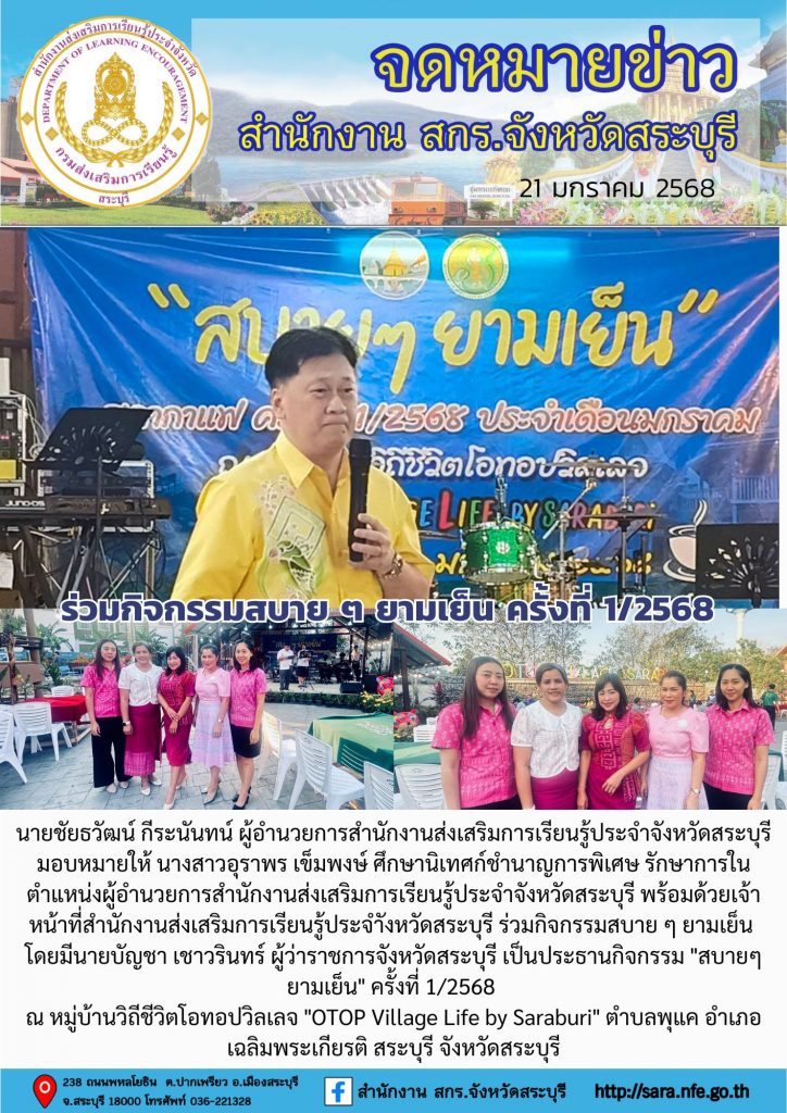 วันอังคารที่ 21 มกราคม 2568 นายชัยธวัฒน์ กีระนันทน์ ผู้อำนวยการสำนักงานส่งเสริมการเรียนรู้ประจำจังหวัดสระบุรี มอบหมายให้ นางสาวอุราพร เข็มพงษ์ ศึกษานิเทศก์ชำนาญการพิเศษ รักษาการในตำแหน่งผู้อำนวยการสำนักงานส่งเสริมการเรียนรู้ประจำจังหวัดสระบุรี พร้อมด้วยเจ้าหน้าที่สำนักงานส่งเสริมการเรียนรู้ประจำังหวัดสระบุรี ร่วมกิจกรรมสบาย ๆ ยามเย็น มีวัตถุประสงค์เพื่อเป็นการหารือข้อราชการอย่างไม่เป็นทางการ สร้างความรักความสามัคคีในหมู่คณะและยังสร้างความสัมพันธไมตรี และกระชับความสัมพันธ์ที่ดีในการปฏิบัติหน้าที่ราชการของทุกภาคส่วน กำหนดจัดขึ้นเป็นประจำทุกเดือน โดยสลับเปลี่ยนหมุนเวียนไปตามหน่วยงานต่าง ๆ ในการเป็นเจ้าภาพ โดยมีนายบัญชา เชาวรินทร์ ผู้ว่าราชการจังหวัดสระบุรี เป็นประธานกิจกรรม “สบายๆยามเย็น” ครั้งที่ 1/2568 ณ หมู่บ้านวิถีชีวิตโอทอปวิลเลจ “OTOP Village Life by Saraburi” ตำบลพุแค อำเภอเฉลิมพระเกียรติ สระบุรี จังหวัดสระบุรี