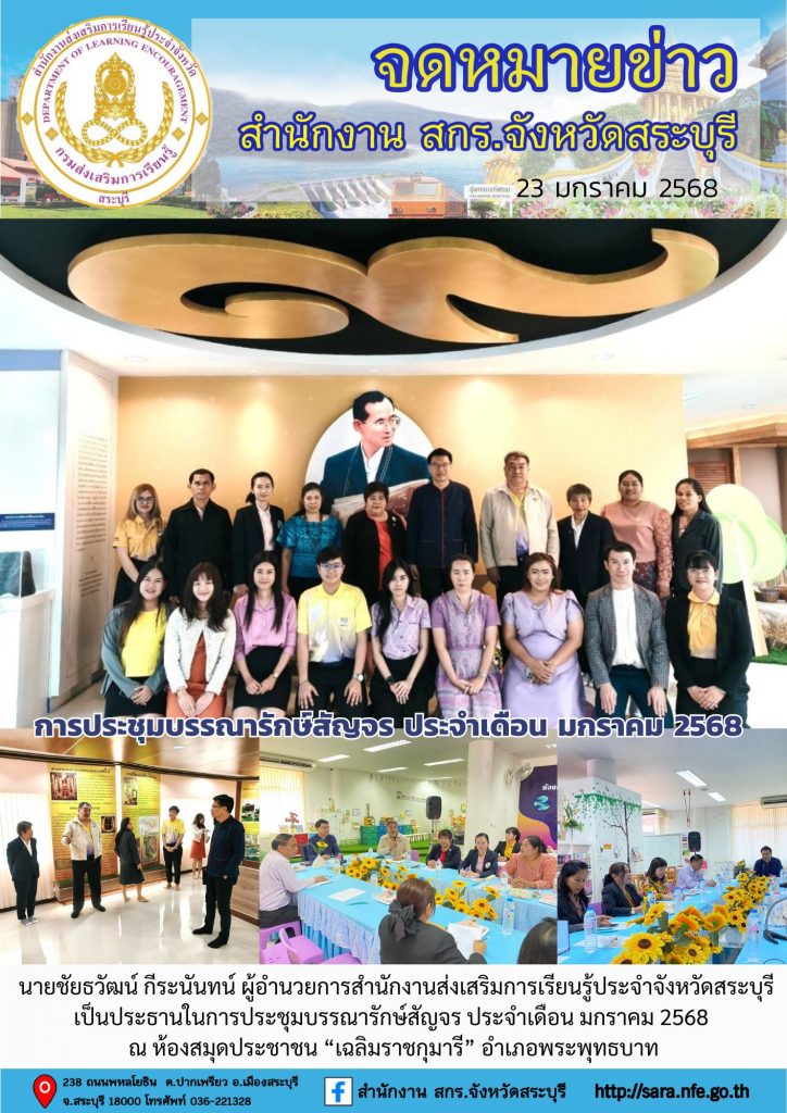 23 มกราคม 2568 นายชัยธวัฒน์ กีระนันทน์ ผู้อำนวยการสำนักงานส่งเสริมการเรียนรู้ประจำจังหวัดสระบุรี เป็นประธานในการประชุมบรรณารักษ์สัญจร ประจำเดือน มกราคม 2568 ณ ห้องสมุดประชาชน “เฉลิมราชกุมารี” อำเภอพระพุทธบาท