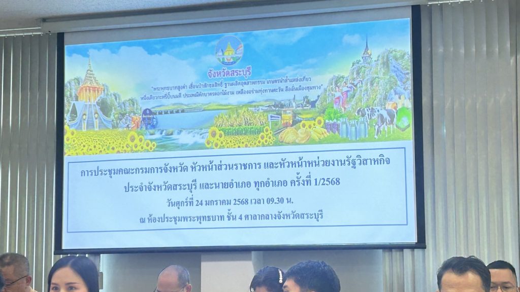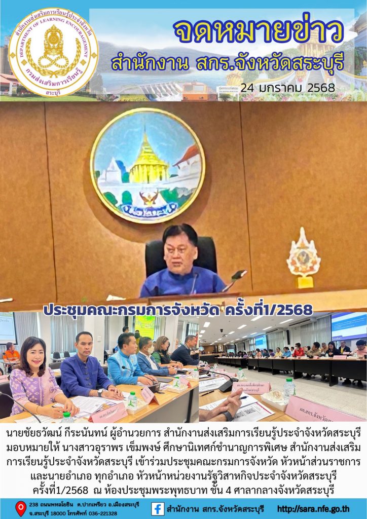 วันศุกร์ที่ 24 มกราคม 2568 นายชัยธวัฒน์ กีระนันทน์ ผู้อำนวยการ สำนักงานส่งเสริมการเรียนรู้ประจำจังหวัดสระบุรี มอบหมายให้ นางสาวอุราพร เข็มพงษ์ ศึกษานิเทศก์ชำนาญการพิเศษ สำนักงานส่งเสริมการเรียนรู้ประจำจังหวัดสระบุรี เข้าร่วมประชุมคณะกรมการจังหวัด หัวหน้าส่วนราชการ และนายอำเภอ ทุกอำเภอ หัวหน้าหน่วยงานรัฐวิสาหกิจประจำจังหวัดสระบุรีครั้งที่1/2568 ณ ห้องประชุมพระพุทธบาท ชั้น 4 ศาลากลางจังหวัดสระบุรี