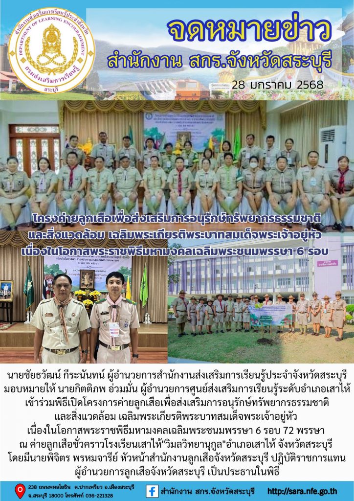 วันอังคารที่ ๒๘ มกราคม ๒๕๖๘ นายชัยธวัฒน์ กีระนันทน์ ผู้อำนวยการสำนักงานส่งเสริมการเรียนรู้ประจำจังหวัดสระบุรี มอบหมายให้ นายกิตติภพ อ่วมมั่น ผู้อำนวยการศูนย์ส่งเสริมการเรียนรู้ระดับอำเภอเสาไห้ เข้าร่วมพิธีเปิดโครงการค่ายลูกเสือเพื่อส่งเสริมการอนุรักษ์ทรัพยากรธรรมชาติและสิ่งแวดล้อม เฉลิมพระเกียรติพระบาทสมเด็จพระเจ้าอยู่หัว เนื่องในโอกาสพระราชพิธีมหามงคลเฉลิมพระชนมพรรษา 6 รอบ 72 พรรษา ณ ค่ายลูกเสือชั่วคราวโรงเรียนเสาไห้”วิมลวิทยานุกูล”อำเภอเสาไห้ จังหวัดสระบุรี โดยมีนายพิจิตร พรหมจารีย์ หัวหน้าสำนักงานลูกเสือจังหวัดสระบุรี ปฎิบัติราชการแทนผู้อำนวยการลูกเสือจังหวัดสระบุรี เป็นประธานในพิธี
