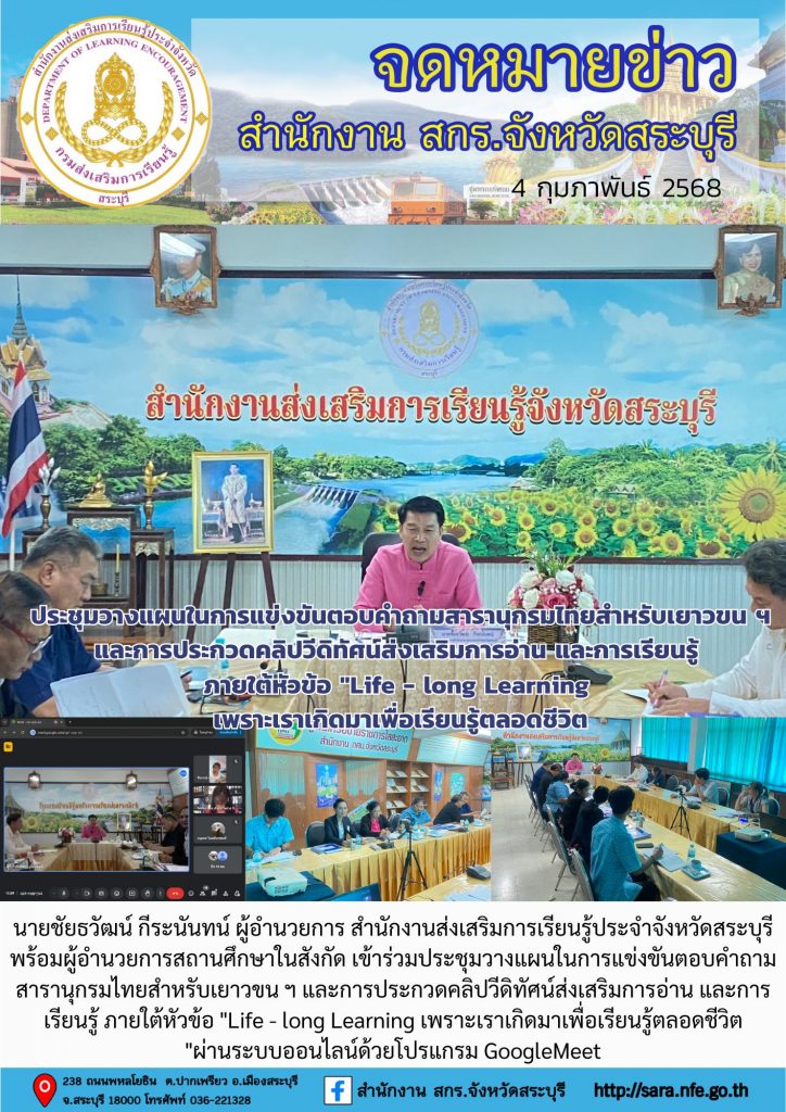 วันที่ 4 กุมภาพันธ์ 2568 นายชัยธวัฒน์ กีระนันทน์ ผู้อำนวยการ สำนักงานส่งเสริมการเรียนรู้ประจำจังหวัดสระบุรี พร้อมผู้อำนวยการสถานศึกษาในสังกัด เข้าร่วมประชุมวางแผนในการแข่งขันตอบคำถามสารานุกรมไทยสำหรับเยาวขน ฯ และการประกวดคลิปวีดิทัศน์ส่งเสริมการอ่าน และการเรียนรู้ ภายใต้หัวข้อ “Life – long Learning เพราะเราเกิดมาเพื่อเรียนรู้ตลอดชีวิต”ผ่านระบบออนไลน์ด้วยโปรแกรม GoogleMeet