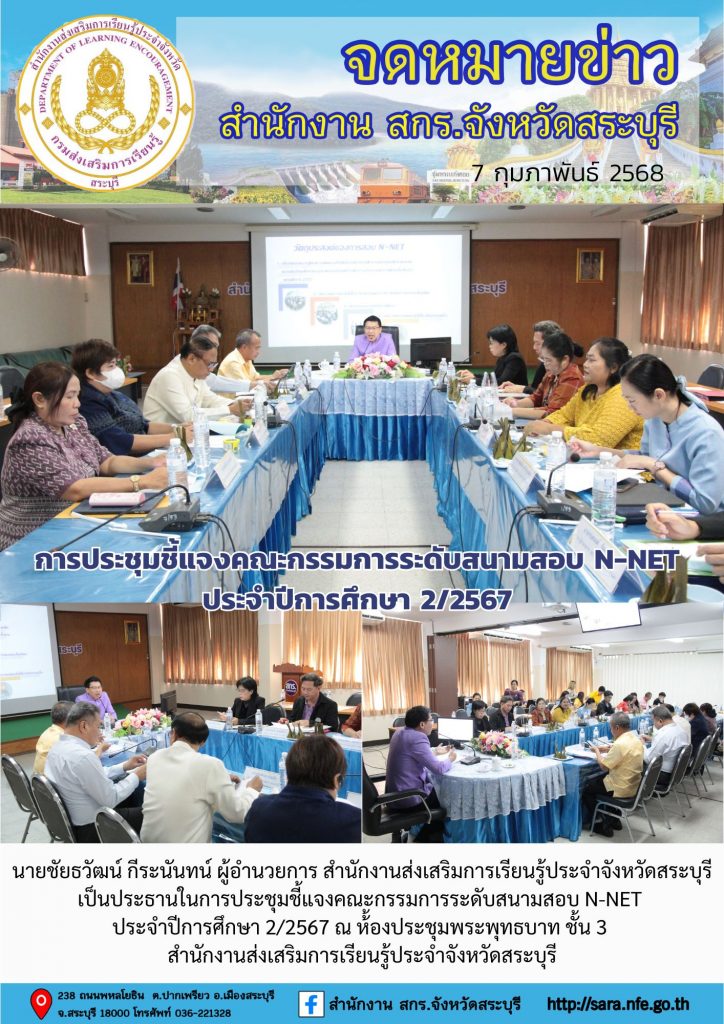 วันที่ 7 กุมภาพันธ์ 2568 นายชัยธวัฒน์ กีระนันทน์ ผู้อำนวยการ สำนักงานส่งเสริมการเรียนรู้ประจำจังหวัดสระบุรี เป็นประธานในการประชุมชี้แจงคณะกรรมการระดับสนามสอบ N-NET ประจำปีการศึกษา 2/2567 ณ ห้้องประชุมพระพุทธบาท ชั้น 3 สำนักงานส่งเสริมการเรียนรู้ประจำจังหวัดสระบุรี