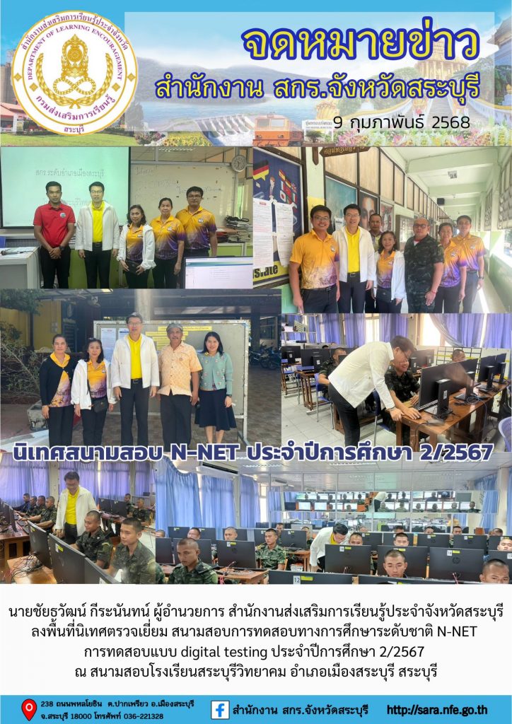 วันที่ 9 กุมภาพันธ์ 2568 นายชัยธวัฒน์ กีระนันทน์ ผู้อำนวยการ สำนักงานส่งเสริมการเรียนรู้ประจำจังหวัดสระบุรี ลงพื้นที่นิเทศตรวจเยี่ยม สนามสอบการทดสอบทางการศึกษาระดับชาติ N-NET การทดสอบแบบ digital testing ประจำปีการศึกษา 2/2567 ณ สนามสอบโรงเรียนสระบุรีวิทยาคม อำเภอเมืองสระบุรี สระบุรี