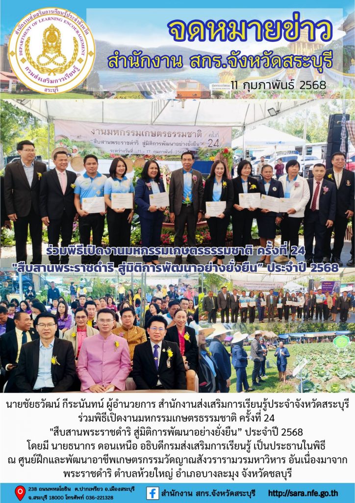 วันที่ 11 กุมภาพันธ์ 2568 นายชัยธวัฒน์ กีระนันทน์ ผู้อำนวยการ สำนักงานส่งเสริมการเรียนรู้ประจำจังหวัดสระบุรี ร่วมพิธีเปิดงานมหกรรมเกษตรธรรมชาติ ครั้งที่ 24 “สืบสานพระราชดำริ สู่มิติการพัฒนาอย่างยั่งยืน” ประจำปี 2568 โดยมี นายธนากร ดอนเหนือ อธิบดีกรมส่งเสริมการเรียนรู้ เป็นประธานในพิธี ณ ศูนย์ฝึกและพัฒนาอาชีพเกษตรกรรมวัดญาณสังวรารามวรมหาวิหาร อันเนื่องมาจากพระราชดำริ ตำบลห้วยใหญ่ อำเภอบางละมุง จังหวัดชลบุรี ซึ่งครั้งนี้ ได้รับความร่วมมือ จากสำนักงานคณะกรรมการพิเศษประสานงานโครงการอันเนื่องมาจากพระราชดำริ (กปร.) หน่วยงานโครงการพัฒนาพื้นที่บริเวณรอบวัดญาณสังวรารามวรมหาวิหาร อันเนื่องมาจากพระราชดำริ สำนักงานส่งเสริมการเรียนรู้ประจำจังหวัดชลบุรี สกร.ระดับอำเภอ กลุ่มศูนย์ฝึกและพัฒนาอาชีพฯ ศูนย์ฝึกทหารใหม่กองยุทธศึกษาทหารเรือกองฝึกหน่วยบัญชาการนาวิกโยธิน องค์กรปกครองส่วนท้องถิ่นในพื้นที่ทุกแห่ง สื่อมวลชนทุกแขนง หน่วยงานทั้งภาครัฐ ภาคเอกชน ชุมชน และภาคประชาชน รวมถึงผู้มีส่วนเกี่ยวข้องทุกฝ่าย
