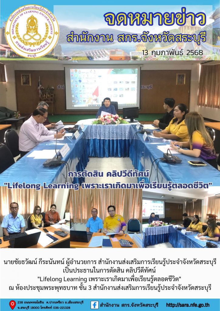 วันที่ 13 กุมภาพันธ์ 2568 นายชัยธวัฒน์ กีระนันทน์ ผู้อำนวยการ สำนักงานส่งเสริมการเรียนรู้ประจำจังหวัดสระบุรี เป็นประธานในการตัดสิน คลิปวีดีทัศน์ “Lifelong Learning เพราะเราเกิดมาเพื่อเรียนรู้ตลอดชีวิต” ณ ห้องประชุมพระพุทธบาท ชั้น 3 สำนักงานส่งเสริมการเรียนรู้ประจำจังหวัดสระบุรี