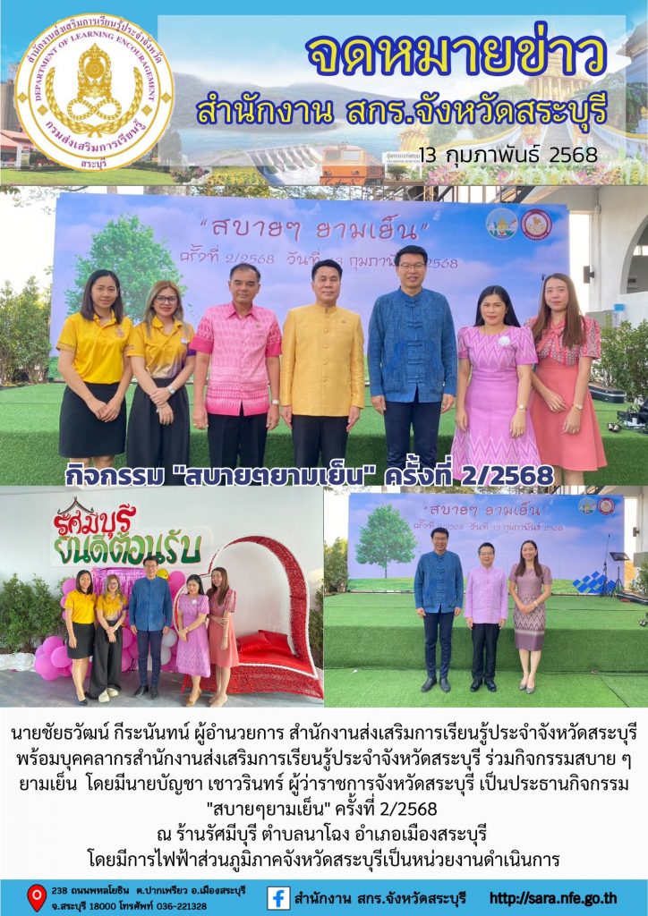 วันที่ 13 กุมภาพันธ์ 2568 นายชัยธวัฒน์ กีระนันทน์ ผู้อำนวยการ สำนักงานส่งเสริมการเรียนรู้ประจำจังหวัดสระบุรี พร้อมบุคคลากรสำนักงานส่งเสริมการเรียนรู้ประจำจังหวัดสระบุรี ร่วมกิจกรรมสบาย ๆ ยามเย็น มีวัตถุประสงค์เพื่อเป็นการหารือข้อราชการอย่างไม่เป็นทางการ สร้างความรักความสามัคคีในหมู่คณะและยังสร้างความสัมพันธไมตรี และกระชับความสัมพันธ์ที่ดีในการปฏิบัติหน้าที่ราชการของทุกภาคส่วน กำหนดจัดขึ้นเป็นประจำทุกเดือน โดยสลับเปลี่ยนหมุนเวียนไปตามหน่วยงานต่าง ๆ ในการเป็นเจ้าภาพ โดยมีนายบัญชา เชาวรินทร์ ผู้ว่าราชการจังหวัดสระบุรี เป็นประธานกิจกรรม “สบายๆยามเย็น” ครั้งที่ 2/2568 ณ ร้านรัศมีบุรี ตำบลนาโฉง อำเภอเมืองสระบุรี โดยมีการไฟฟ้าส่วนภูมิภาคจังหวัดสระบุรีเป็นหน่วยงานดำเนินการ