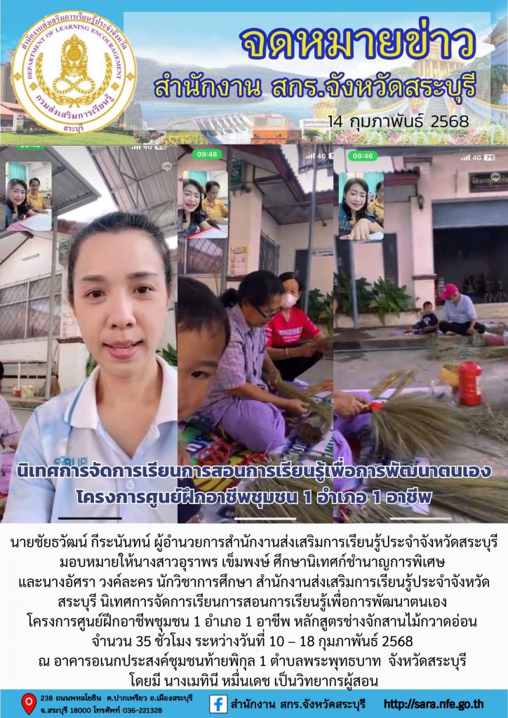 วันศุกร์ที่ 14 กุมภาพันธ์ 2568 นายชัยธวัฒน์ กีระนันทน์ ผู้อำนวยการสำนักงานส่งเสริมการเรียนรู้ประจำจังหวัดสระบุรี มอบหมายให้นางสาวอุราพร เข็มพงษ์ ศึกษานิเทศก์ชำนาญการพิเศษ และนางอัศรา วงค์ละคร นักวิชาการศึกษา สำนักงานส่งเสริมการเรียนรู้ประจำจังหวัดสระบุรี นิเทศการจัดการเรียนการสอนการเรียนรู้เพื่อการพัฒนาตนเอง (งานการศึกษาต่อเนื่อง) โครงการศูนย์ฝึกอาชีพชุมชน 1 อำเภอ 1 อาชีพ หลักสูตรช่างจักสานไม้กวาดอ่อน จำนวน 35 ชั่วโมง ระหว่างวันที่ 10 – 18 กุมภาพันธ์ 2568 ณ อาคารอเนกประสงค์ชุมชนท้ายพิกุล 1 ตำบลพระพุทธบาท อำเภอพระพุทธบาท จังหวัดสระบุรี โดยมี นางเมทินี หมื่นเดช เป็นวิทยากรผู้สอน