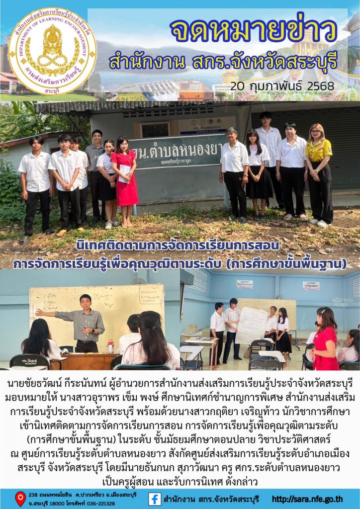 วันที่ 20 กุมภาพันธ์ 2568 นายชัยธวัฒน์ กีระนันทน์ ผู้อำนวยการสำนักงานส่งเสริมการเรียนรู้ประจำจังหวัดสระบุรี มอบหมายให้ นางสาวอุราพร เข็ม พงษ์ ศึกษานิเทศก์ชำนาญการพิเศษ สำนักงานส่งเสริมการเรียนรู้ประจำจังหวัดสระบุรี พร้อมด้วยนางสาวกฤติยา เจริญท้าว นักวิชาการศึกษา เข้านิเทศติดตามการจัดการเรียนการสอน การจัดการเรียนรู้เพื่อคุณวุฒิตามระดับ (การศึกษาขั้นพื้นฐาน) ในระดับ ชั้นมัธยมศึกษาตอนปลาย วิชาประวัติศาสตร์ ณ ศูนย์การเรียนรู้ระดับตำบลหนองยาว สังกัดศูนย์ส่งเสริมการเรียนรู้ระดับอำเภอเมืองสระบุรี จังหวัดสระบุรี โดยมีนายธันกนก สุภาวัฒนา ครู ศกร.ระดับตำบลหนองยาว เป็นครูผู้สอน และรับการนิเทศ ดังกล่าว