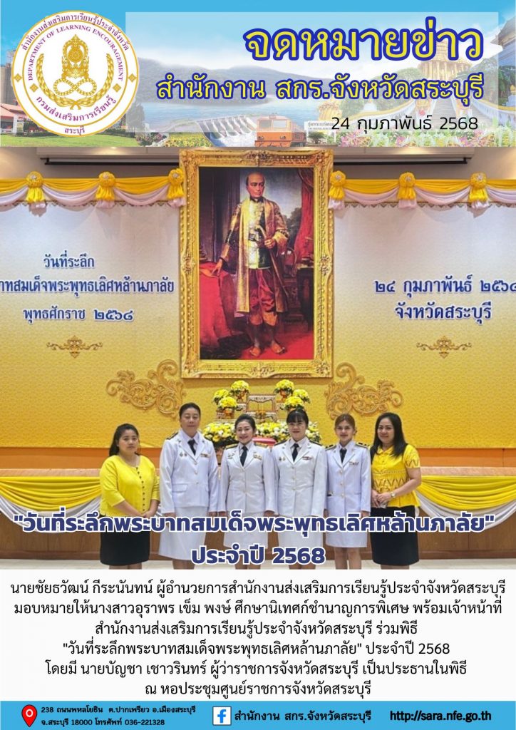 วันที่ 24 กุมภาพันธ์ 2568 นายชัยธวัฒน์ กีระนันทน์ ผู้อำนวยการสำนักงานส่งเสริมการเรียนรู้ประจำจังหวัดสระบุรี มอบหมายให้นางสาวอุราพร เข็ม พงษ์ ศึกษานิเทศก์ชำนาญการพิเศษ พร้อมเจ้าหน้าที่สำนักงานส่งเสริมการเรียนรู้ประจำจังหวัดสระบุรี ร่วมพิธี “วันที่ระลึกพระบาทสมเด็จพระพุทธเลิศหล้านภาลัย” ประจำปี 2568 โดยมี นายบัญชา เชาวรินทร์ ผู้ว่าราชการจังหวัดสระบุรี เป็นประธานในพิธี ณ หอประชุมศูนย์ราชการจังหวัดสระบุรี