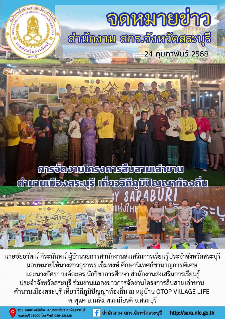 วันที่ 24 กุมภาพันธ์ 2568 นายชัยธวัฒน์ กีระนันทน์ ผู้อำนวยการสำนักงานส่งเสริมการเรียนรู้ประจำจังหวัดสระบุรี มอบหมายให้นางสาวอุราพร เข็มพงษ์ ศึกษานิเทศก์ชำนาญการพิเศษ และนางอัศรา วงค์ละคร นักวิชาการศึกษา สำนักงานส่งเสริมการเรียนรู้ประจำจังหวัดสระบุรี ร่วมงานแถลงข่าวการจัดงานโครงการสืบสานเล่าขาน ตำนานเมืองสระบุรี เที่ยววิถีภูมิปัญญาท้องถิ่น ณ หมู่บ้าน OTOP VIlLAGE LIFE ต.พุแค อ.เฉลิมพระเกียรติ จ.สระบุรี