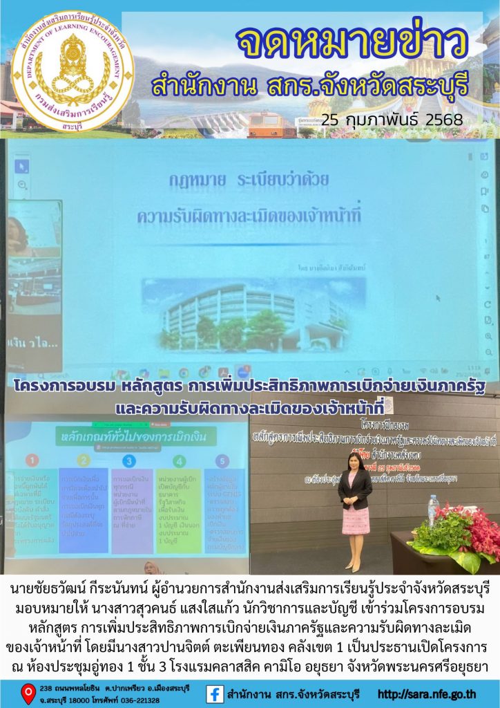 วันที่ 25 กุมภาพันธ์ 2568 นายชัยธวัฒน์ กีระนันทน์ ผู้อำนวยการสำนักงานส่งเสริมการเรียนรู้ประจำจังหวัดสระบุรี มอบหมายให้ นางสาวสุวคนธ์ แสงใสแก้ว นักวิชาการและบัญชี เข้าร่วมโครงการอบรม หลักสูตร การเพิ่มประสิทธิภาพการเบิกจ่ายเงินภาครัฐและความรับผิดทางละเมิดของเจ้าหน้าที่ โดยมีนางสาวปานจิตต์ ตะเพียนทอง คลังเขต 1 เป็นประธานเปิดโครงการ ซึ่งมีวัตถุประสงค์ เพื่อให้เจ้าหน้าที่เข้าใจเจตนารมย์ของระเบียบกระทรวงการคลังว่าด้วยการเบิกจ่ายเงินจากคลัง การรับเงิน การจ่ายเงิน การเก็บรักษาเงิน และการนำเงินส่งคลัง พ.ศ. 2562 และพระราชบัญญัติความรับผิดทางละเมิดของเจ้าหน้าที่ พ.ศ. 2539 เพิ่มสมรรถนะขีดความสามารถด้านการเงินการคลัง ให้สอดคล้องกับการปฎิบัติหน้าที่ ได้แลกปลี่ยนความคิดเห็น ทัศนคติ และประสบการณ์ในการปฏิบัติงาน อันจะเป็นประโยชน์ต่อการปฏิบัติราชการ ซึ่งมีผู้เข้าร่วมโครงการ จำนวน 150 ท่าน ณ ห้องประชุมอู่ทอง 1 ชั้น 3 โรงแรมคลาสสิค คามิโอ อยุธยา จังหวัดพระนครศรีอยุธยา
