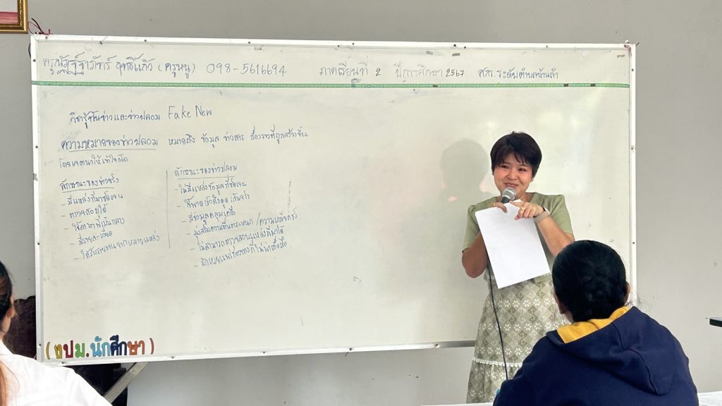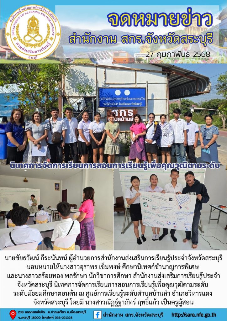 วันพฤหัสบดีที่ 27 กุมภาพันธ์ 2568 นายชัยธวัฒน์ กีระนันทน์ ผู้อำนวยการสำนักงานส่งเสริมการเรียนรู้ประจำจังหวัดสระบุรี มอบหมายให้นางสาวอุราพร เข็มพงษ์ ศึกษานิเทศก์ชำนาญการพิเศษ และนางสาวสร้อยทอง พลรักษา นักวิชาการศึกษา สำนักงานส่งเสริมการเรียนรู้ประจำจังหวัดสระบุรี นิเทศการจัดการเรียนการสอนการเรียนรู้เพื่อคุณวุฒิตามระดับ ระดับมัธยมศึกษาตอนต้น ณ ศูนย์การเรียนรู้ระดับตำบลบ้านลำ อำเภอวิหารแดง จังหวัดสระบุรี โดยมี นางสาวณัฏฐ์ฐาภัทร์ ฤทธิ์แก้ว เป็นครูผู้สอน