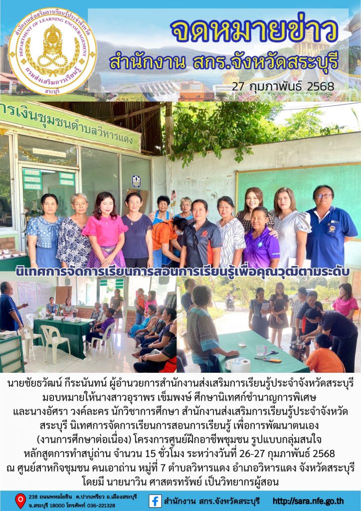 วันพฤหัสบดีที่ 27 กุมภาพันธ์ 2568 นายชัยธวัฒน์ กีระนันทน์ ผู้อำนวยการสำนักงานส่งเสริมการเรียนรู้ประจำจังหวัดสระบุรี มอบหมายให้นางสาวอุราพร เข็มพงษ์ ศึกษานิเทศก์ชำนาญการพิเศษ และนางอัศรา วงค์ละคร นักวิชาการศึกษา สำนักงานส่งเสริมการเรียนรู้ประจำจังหวัดสระบุรี นิเทศการจัดการเรียนการสอนการเรียนรู้ เพื่อการพัฒนาตนเอง (งานการศึกษาต่อเนื่อง) โครงการศูนย์ฝึกอาชีพชุมชน รูปแบบกลุ่มสนใจ หลักสูตการทำสบู่ถ่าน จำนวน 15 ชั่วโมง ระหว่างวันที่ 26-27 กุมภาพันธ์ 2568 ณ ศูนย์สาหกิจชุมชน คนเอาถ่าน หมู่ที่ 7 ตำบลวิหารแดง อำเภอวิหารแดง จังหวัดสระบุรี โดยมี นายนาวิน ศาสตรทรัพย์ เป็นวิทยากรผู้สอน