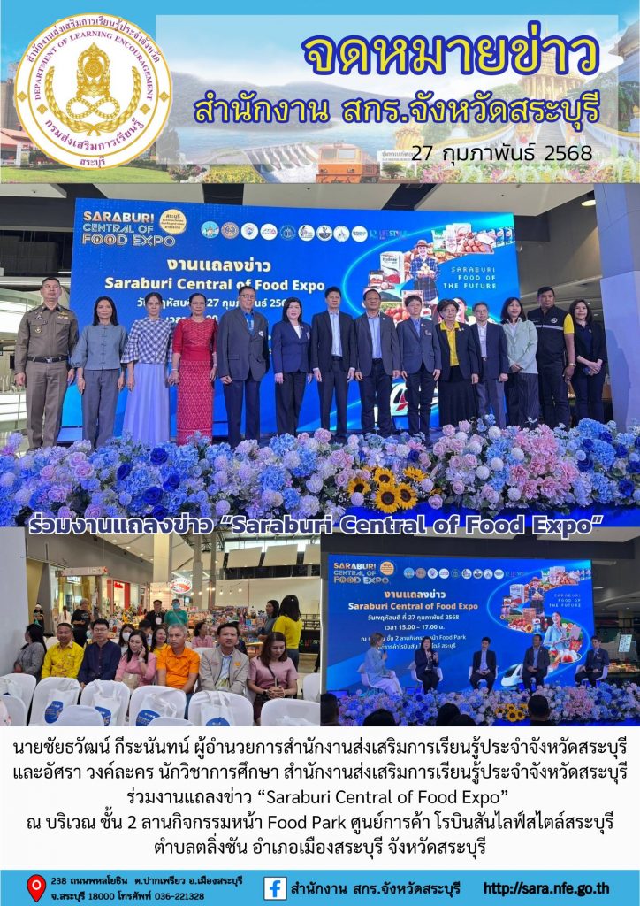 วันพฤหัสบดีที่ 27 กุมภาพันธ์ 2568 นายชัยธวัฒน์ กีระนันทน์ ผู้อำนวยการสำนักงานส่งเสริมการเรียนรู้ประจำจังหวัดสระบุรี และอัศรา วงค์ละคร นักวิชาการศึกษา สำนักงานส่งเสริมการเรียนรู้ประจำจังหวัดสระบุรี ร่วมงานแถลงข่าว “Saraburi Central of Food Expo” ณ บริเวณ ชั้น 2 ลานกิจกรรมหน้า Food Park ศูนย์การค้า โรบินสันไลฟ์สไตล์สระบุรี ตำบลตลิ่งชัน อำเภอเมืองสระบุรี จังหวัดสระบุรี