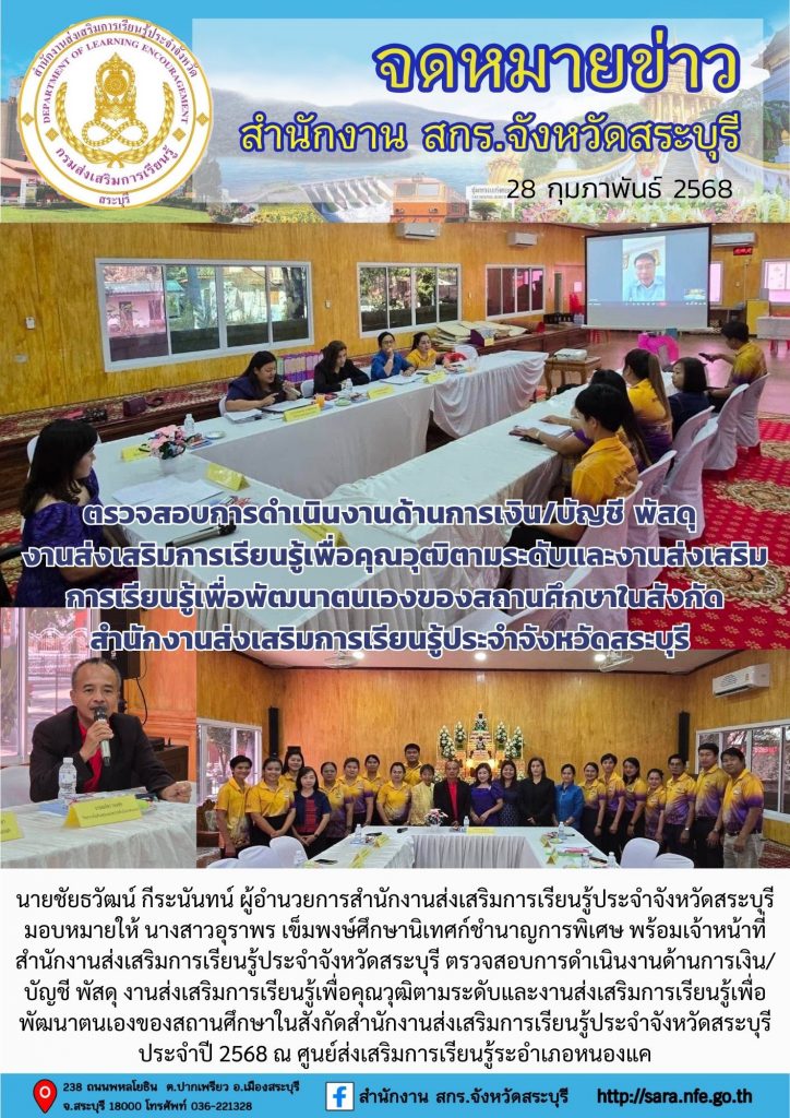 ตรวจสอบการดำเนินงานด้านการเงิน/บัญชี พัสดุ งานส่งเสริมการเรียนรู้เพื่อคุณวุฒิตามระดับและงานส่งเสริมการเรียนรู้เพื่อพัฒนาตนเองของสถานศึกษาในสังกัดสำนักงานส่งเสริมการเรียนรู้ประจำจังหวัดสระบุรี ประจำปี 2568