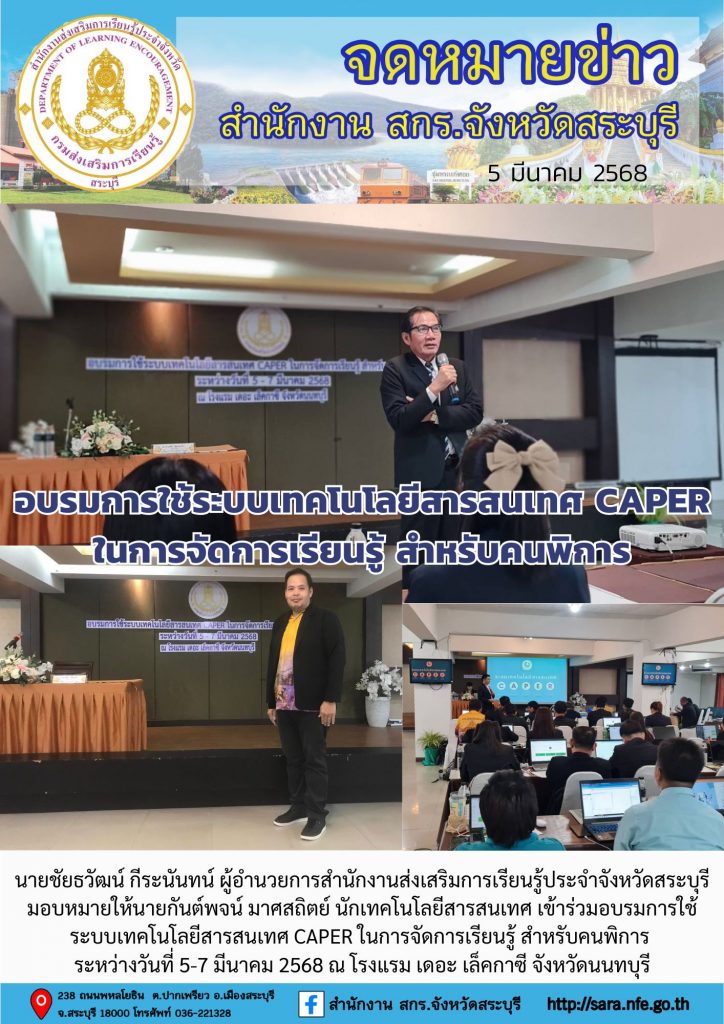 วันที่ 5 มีนาคม 2568 นายชัยธวัฒน์ กีระนันทน์ ผู้อำนวยการสำนักงานส่งเสริมการเรียนรู้ประจำจังหวัดสระบุรี มอบหมายให้นายกันต์พจน์ มาศสถิตย์ นักเทคโนโลยีสารสนเทศ เข้าร่วมอบรมการใช้ระบบเทคโนโลยีสารสนเทศ CAPER ในการจัดการเรียนรู้ สำหรับคนพิการ ระหว่างวันที่ 5-7 มีนาคม 2568 ณ โรงแรม เดอะ เล็คกาซี จังหวัดนนทบุรี