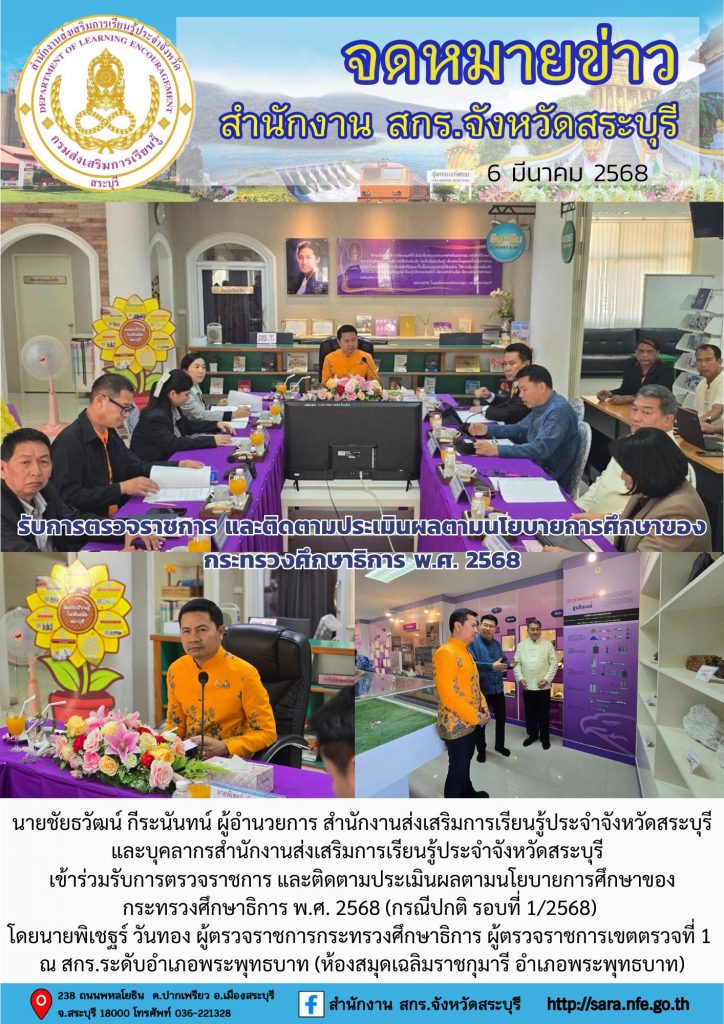 วันพฤหัสบดีที่ 6 มีนาคม 2568 นายชัยธวัฒน์ กีระนันทน์ ผู้อำนวยการ สำนักงานส่งเสริมการเรียนรู้ประจำจังหวัดสระบุรี และบุคลากรสำนักงานส่งเสริมการเรียนรู้ประจำจังหวัดสระบุรี เข้าร่วมรับการตรวจราชการ และติดตามประเมินผลตามนโยบายการศึกษาของกระทรวงศึกษาธิการ พ.ศ. 2568 (กรณีปกติ รอบที่ 1/2568) โดยนายพิเชฐร์ วันทอง ผู้ตรวจราชการกระทรวงศึกษาธิการ ผู้ตรวจราชการเขตตรวจที่ 1 ณ สกร.ระดับอำเภอพระพุทธบาท (ห้องสมุดเฉลิมราชกุมารี อำเภอพระพุทธบาท)
