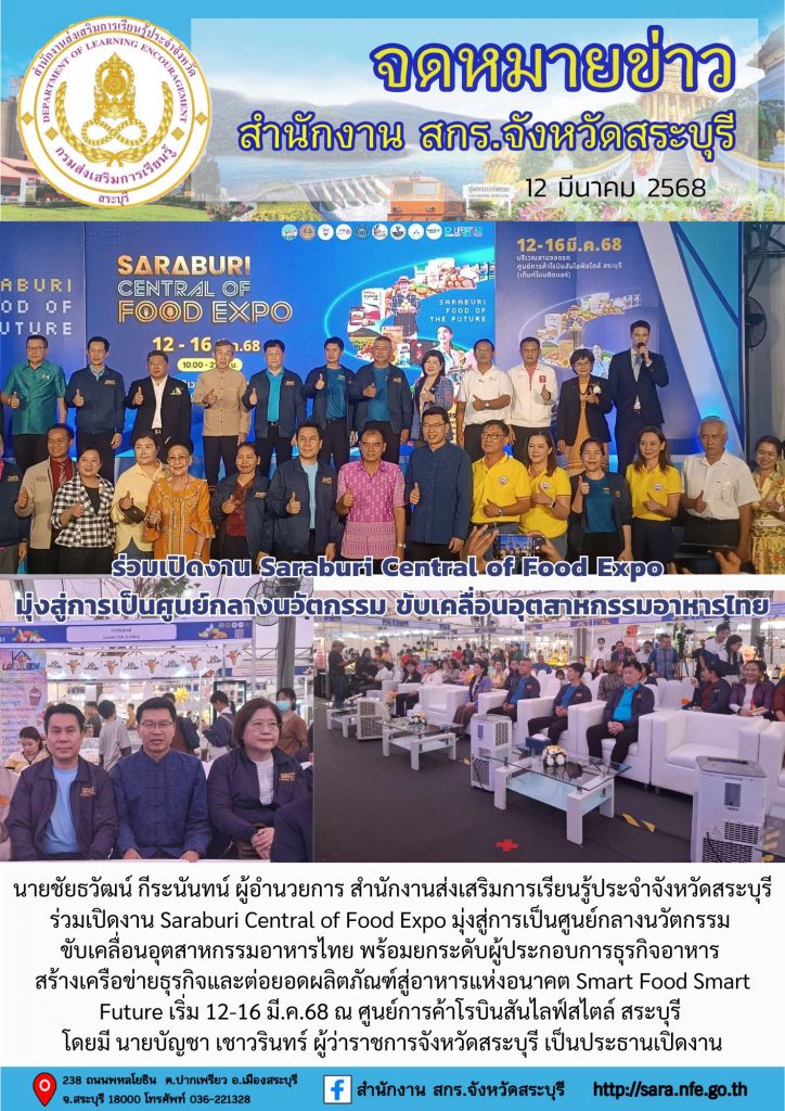 วันที่ 12 มีนาคม 2568 นายชัยธวัฒน์ กีระนันทน์ ผู้อำนวยการ สำนักงานส่งเสริมการเรียนรู้ประจำจังหวัดสระบุรี ร่วมเปิดงาน Saraburi Central of Food Expo มุ่งสู่การเป็นศูนย์กลางนวัตกรรม ขับเคลื่อนอุตสาหกรรมอาหารไทย พร้อมยกระดับผู้ประกอบการธุรกิจอาหาร สร้างเครือข่ายธุรกิจและต่อยอดผลิตภัณฑ์สู่อาหารแห่งอนาคต Smart Food Smart Future เริ่ม 12-16 มี.ค.68 ณ ศูนย์การค้าโรบินสันไลฟ์สไตล์ สระบุรี โดยมี นายบัญชา เชาวรินทร์ ผู้ว่าราชการจังหวัดสระบุรี เป็นประธานเปิดงาน