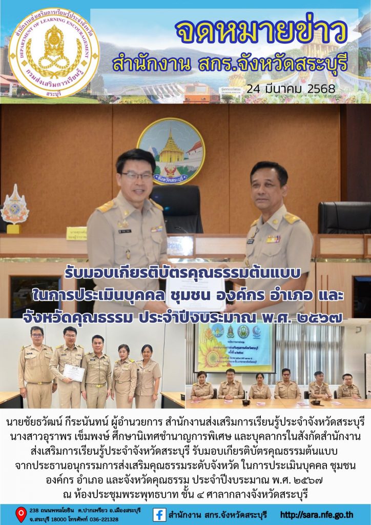 วันจันทร์ที่ ๒๔ มีนาคม ๒๕๖๘ เวลา ๑๓.๐๐ น. นายชัยธวัฒน์ กีระนันทน์ ผู้อำนวยการ สำนักงานส่งเสริมการเรียนรู้ประจำจังหวัดสระบุรี นางสาวอุราพร เข็มพงษ์ ศึกษานิเทศชำนาญการพิเศษ และบุคลากรในสังกัดสำนักงานส่งเสริมการเรียนรู้ประจำจังหวัดสระบุรี รับมอบเกียรติบัตรคุณธรรมต้นแบบ จากประธานอนุกรรมการส่งเสริมคุณธรรมระดับจังหวัด ในการประเมินบุคคล ชุมชน องค์กร อำเภอ และจังหวัดคุณธรรม ประจำปีงบระมาณ พ.ศ. ๒๕๖๗ ณ ห้องประชุมพระพุทธบาท ชั้น ๔ ศาลากลางจังหวัดสระบุรี