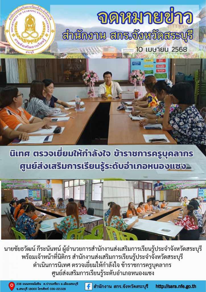วันที่ 10 เมษายน 2568 นายชัยธวัฒน์ กีระนันทน์ ผู้อำนวยการสำนักงานส่งเสริมการเรียนรู้ประจำจังหวัดสระบุรี พร้อมเจ้าหน้าที่นิติกร สำนักงานส่งเสริมการเรียนรู้ประจำจังหวัดสระบุรี ดำเนินการนิเทศ ตรวจเยี่ยมให้กำลังใจ ข้าราชการครูบุคลากร ศูนย์ส่งเสริมการเรียนรู้ระดับอำเภอหนองแซง