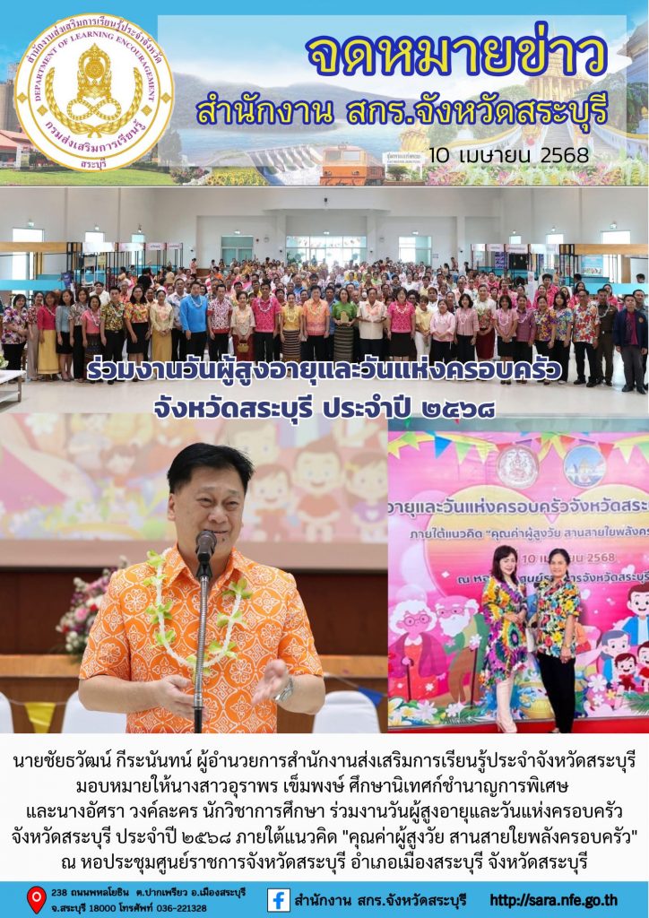 นายชัยธวัฒน์ กีระนันทน์ ผู้อำนวยการสำนักงานส่งเสริมการเรียนรู้ประจำจังหวัดสระบุรี มอบหมายให้นางสาวอุราพร เข็มพงษ์ ศึกษานิเทศก์ชำนาญการพิเศษ และนางอัศรา วงค์ละคร นักวิชาการศึกษา ร่วมงานวันผู้สูงอายุและวันแห่งครอบครัวจังหวัดสระบุรี ประจำปี ๒๕๖๘ ภายใต้แนวคิด “คุณค่าผู้สูงวัย สานสายใยพลังครอบครัว” ณ หอประชุมศูนย์ราชการจังหวัดสระบุรี อำเภอเมืองสระบุรี จังหวัดสระบุรี วันที่ ๑๐ เมษายน ๒๕๖๘