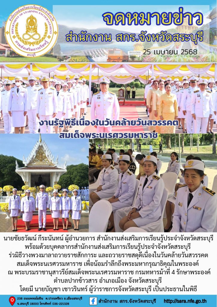วันที่ 25 เมษายน 2568 นายชัยธวัฒน์ กีระนันทน์ ผู้อำนวยการ สำนักงานส่งเสริมการเรียนรู้ประจำจังหวัดสระบุรี พร้อมด้วยบุคคลากรสำนักงานส่งเสริมการเรียนรู้ประจำจังหวัดสระบุรี ร่วมิธีวางพวงมาลาถวายราชสักการะ และถวายราชสดุดีเนื่องในวันคล้ายวันสวรรคตสมเด็จพระนเรศวรมหาราช เพื่อน้อมรำลึกถึงพระมหากรุณาธิคุณในพระองค์ ที่ทรงมีต่อชาติไทยและประชาชนชาวไทย ณ พระบรมราชานุสาวรีย์สมเด็จพระนเรศวรมหาราช กรมทหารม้าที่ 4 รักษาพระองค์ ตำบลปากข้าวสาร อำเภอเมือง จังหวัดสระบุรี โดยมี นายบัญชา เชาวรินทร์ ผู้ว่าราชการจังหวัดสระบุรี เป็นประธานในพิธี