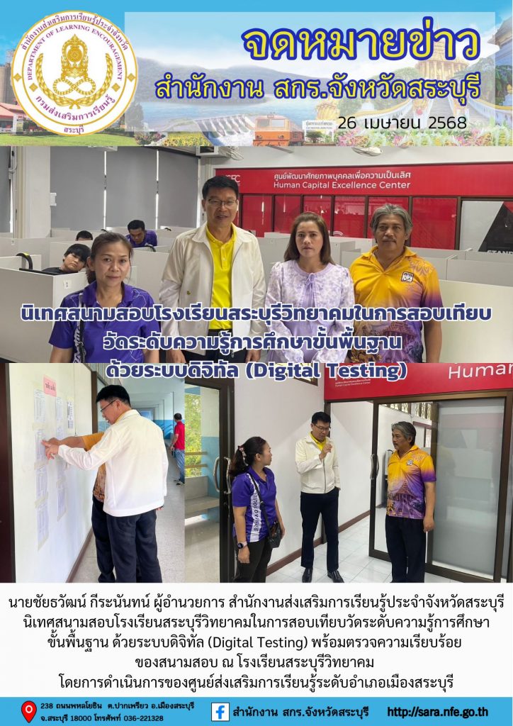 วันที่ 26 เมษายน 2568 นายชัยธวัฒน์ กีระนันทน์ ผู้อำนวยการ สำนักงานส่งเสริมการเรียนรู้ประจำจังหวัดสระบุรี นิเทศสนามสอบโรงเรียนสระบุรีวิทยาคมในการสอบเทียบวัดระดับความรู้การศึกษาขั้นพื้นฐาน ด้วยระบบดิจิทัล (Digital Testing) พร้อมตรวจความเรียบร้อย ของสนามสอบ ณ โรงเรียนสระบุรีวิทยาคม โดยการดำเนินการของศูนย์ส่งเสริมการเรียนรู้ระดับอำเภอเมืองสระบุรี