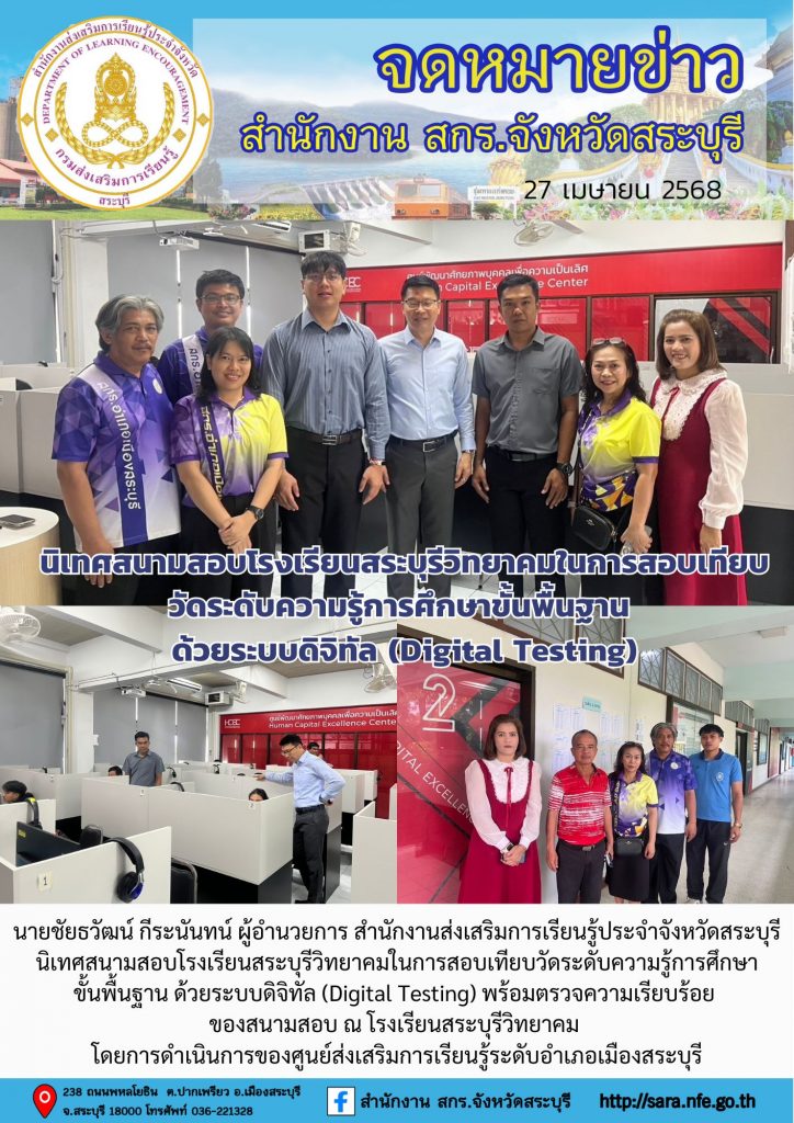 วันที่ 27 เมษายน 2568 นายชัยธวัฒน์ กีระนันทน์ ผู้อำนวยการ สำนักงานส่งเสริมการเรียนรู้ประจำจังหวัดสระบุรี นิเทศสนามสอบโรงเรียนสระบุรีวิทยาคมในการสอบเทียบวัดระดับความรู้การศึกษาขั้นพื้นฐาน ด้วยระบบดิจิทัล (Digital Testing) พร้อมตรวจความเรียบร้อย ของสนามสอบ ณ โรงเรียนสระบุรีวิทยาคม โดยการดำเนินการของศูนย์ส่งเสริมการเรียนรู้ระดับอำเภอเมืองสระบุรี