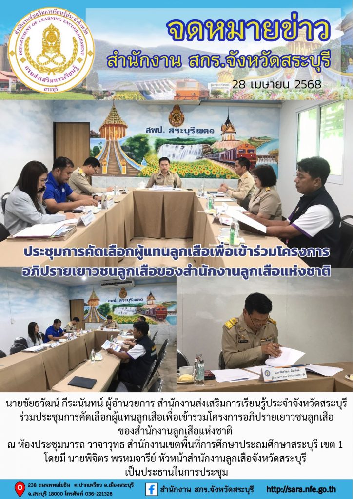 วันที่ 28 เมษายน 2568 นายชัยธวัฒน์ กีระนันทน์ ผู้อำนวยการ สำนักงานส่งเสริมการเรียนรู้ประจำจังหวัดสระบุรี ร่วมประชุมการคัดเลือกผู้แทนลูกเสือเพื่อเข้าร่วมโครงการอภิปรายเยาวชนลูกเสือของสำนักงานลูกเสือแห่งชาติ ณ ห้องประชุมนารถ วาจาวุทธ สำนักงานเขตพื้นที่การศึกษาประถมศึกษาสระบุรี เขต 1 โดยมี นายพิจิตร พรหมจารีย์ หัวหน้าสำนักงานลูกเสือจังหวัดสระบุรี เป็นประธานในการประชุม