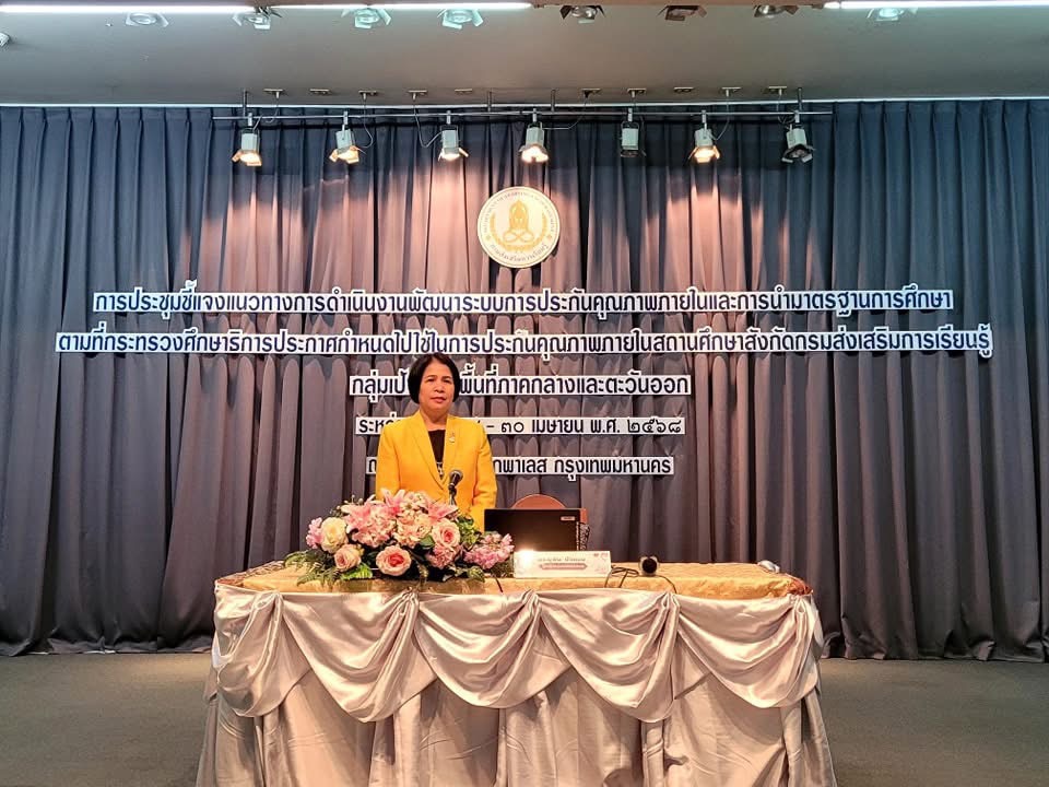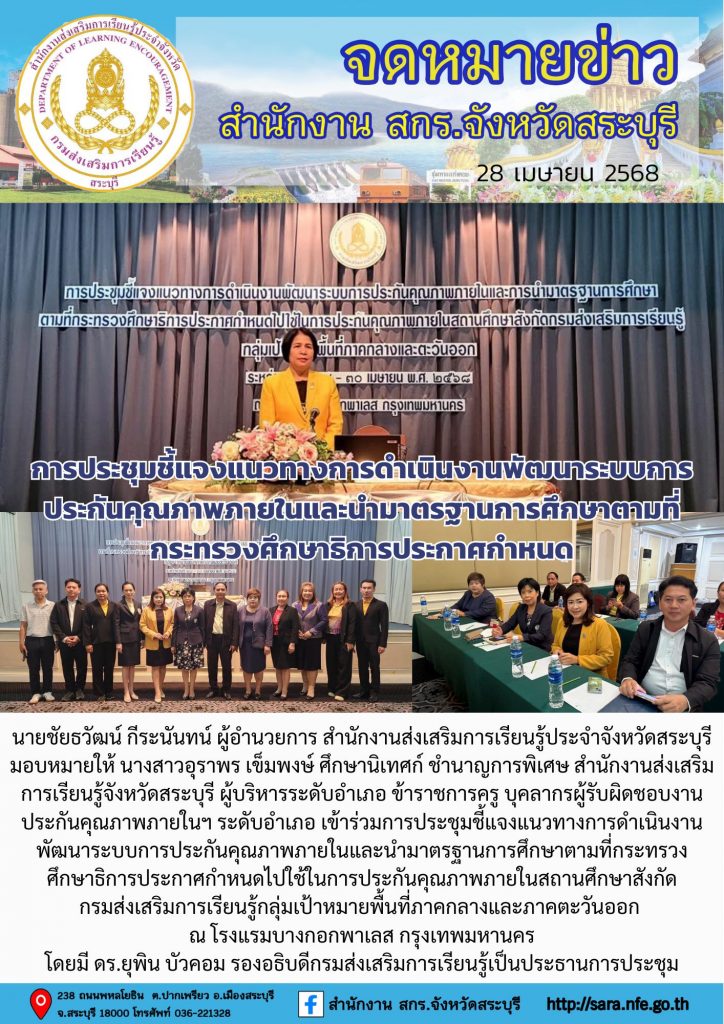 วันที่ 28 -30 เมษายน 2568 นายชัยธวัฒน์ กีระนันทน์ ผู้อำนวยการ สำนักงานส่งเสริมการเรียนรู้ประจำจังหวัดสระบุรี มอบหมายให้ นางสาวอุราพร เข็มพงษ์ ศึกษานิเทศก์ ชำนาญการพิเศษ สำนักงานส่งเสริมการเรียนรู้จังหวัดสระบุรี ผู้บริหารระดับอำเภอ ข้าราชการครู บุคลากรผู้รับผิดชอบงานประกันคุณภาพภายในฯ ระดับอำเภอ เข้าร่วมการประชุมชี้แจงแนวทางการดำเนินงานพัฒนาระบบการประกันคุณภาพภายในและนำมาตรฐานการศึกษาตามที่กระทรวงศึกษาธิการประกาศกำหนดไปใช้ในการประกันคุณภาพภายในสถานศึกษาสังกัดกรมส่งเสริมการเรียนรู้กลุ่มเป้าหมายพื้นที่ภาคกลางและภาคตะวันออก ณ โรงแรมบางกอกพาเลส กรุงเทพมหานคร