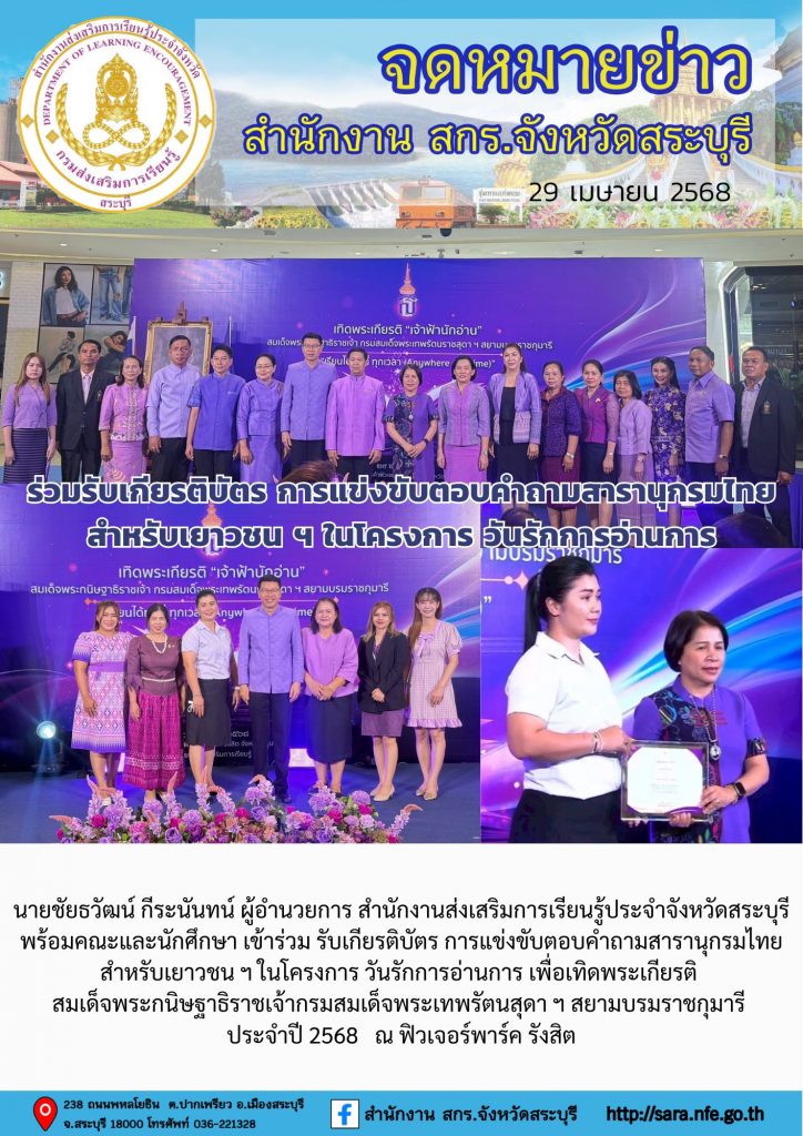 วันที่ 29 เมษายน 2568 นายชัยธวัฒน์ กีระนันทน์ ผู้อำนวยการ สำนักงานส่งเสริมการเรียนรู้ประจำจังหวัดสระบุรี พร้อมบุคลากรในสังกัดและคณะนักศึกษา เข้าร่วมงาน “ วันรักการอ่าน ” เพื่อเทิดพระเกียรติสมเด็จพระกนิษฐาธิราชเจ้า กรมสมเด็จพระเทพรัตนราชสุดาฯ สยามบรมราชกุมารี ประจำปีงบประมาณ พ.ศ. 2568 โดยภายในงานประกอบด้วยพิธีมอบโล่รางวัลและเกียรติบัตรการแข่งขันตอบคำถามจากการอ่านสารานุกรมไทยสำหรับเยาวชนฯ การประกวดคลิปวีดิทัศน์ส่งเสริมการอ่านและการเรียนรู้ ภายใต้หัวข้อ “Life-long Learning เพราะเราเกิดมาเพื่อเรียนรู้ตลอดชีวิต” นิทรรศการศูนย์การเรียนรู้ (Co – Learning Space) ดีเด่น ระดับประเทศ ปีงบประมาณ พ.ศ. 2567 นิทรรศการห้องสมุดประชาชนเคลื่อนที่ดีเด่น ระดับประเทศ ปีงบประมาณ พ.ศ. 2567 และนิทรรศการกิจกรรมส่งเสริมการอ่านและการเรียนรู้ ณ บริเวณชั้น G โซน ZPOTLIGHT ศูนย์การค้าฟิวเจอร์พาร์ค รังสิต จังหวัดปทุมธานี