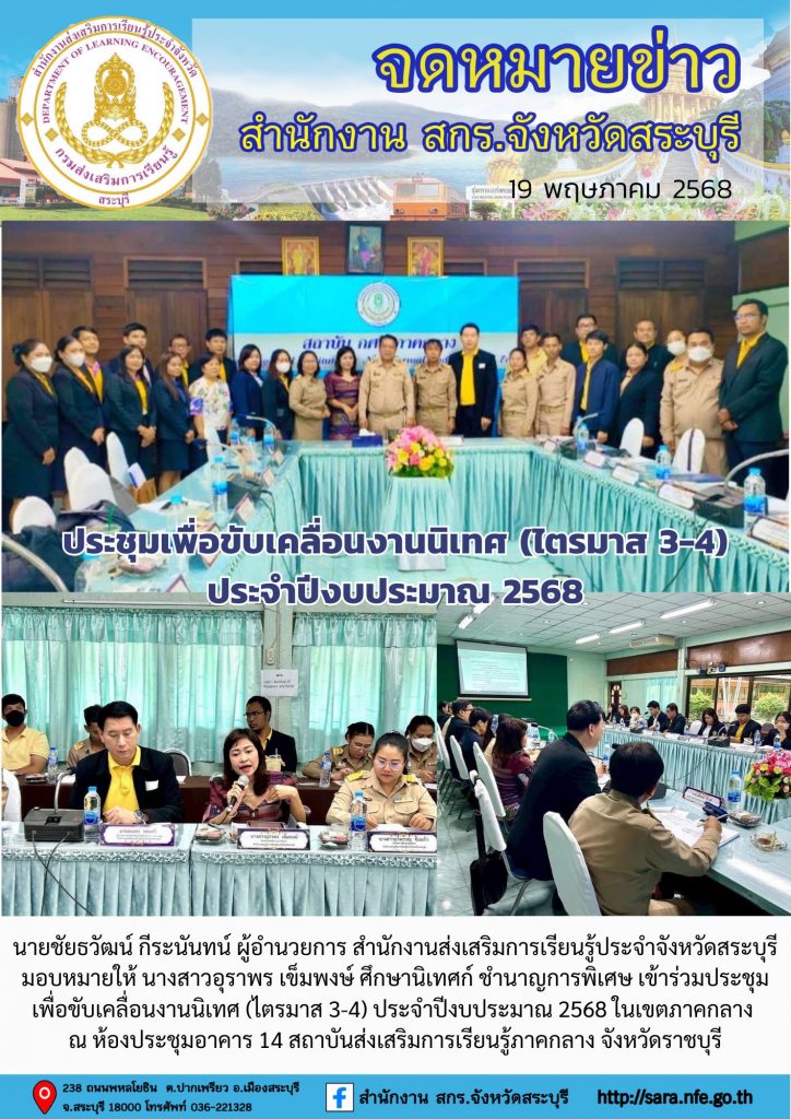 วันจันทร์ทึ่ 19 พฤษภาคม 2568 นายชัยธวัฒน์ กีระนันทน์ ผู้อำนวยการ สำนักงานส่งเสริมการเรียนรู้ประจำจังหวัดสระบุรี มอบหมายให้ นางสาวอุราพร เข็มพงษ์ ศึกษานิเทศก์ ชำนาญการพิเศษ เข้าร่วมประ ชุมเพื่อขับเคลื่อนงานนิเทศ (ไตรมาส 3-4) ระจำปีงบประมาณ 2568 ในเขตภาคกลาง ณ ห้องประชุมอาคาร 14 สถาบันส่งเสริมการเรียนรู้ภาคกลาง จังหวัดราชบุรี