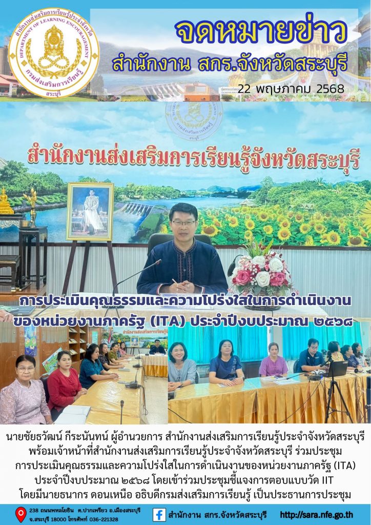 วันที่ 22 พฤษภาคม 2568 นายชัยธวัฒน์ กีระนันทน์ ผู้อำนวยการ สำนักงานส่งเสริมการเรียนรู้ประจำจังหวัดสระบุรี พร้อมเจ้าหน้าที่สำนักงานส่งเสริมการเรียนรู้ประจำจังหวัดสระบุรี ร่วมประชุมการประเมินคุณธรรมและความโปร่งใสในการดำเนินงานของหน่วยงานภาครัฐ (ITA) ประจำปีงบประมาณ ๒๕๖๘ โดยเข้าร่วมประชุมชี้แจงการตอบแบบวัด IIT โดยมีนายธนากร ดอนเหนือ อธิบดีกรมส่งเสริมการเรียนรู้ เป็นประธานการประชุม ผ่านระบบออนไลน์