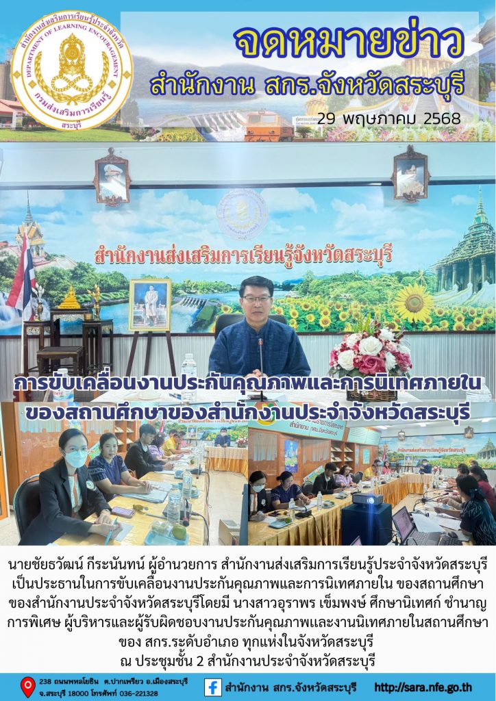 วันพฤหัสบดีที่ 29พฤษภาคม 2568 นายชัยธวัฒน์ กีระนันทน์ ผู้อำนวยการ สำนักงานส่งเสริมการเรียนรู้ประจำจังหวัดสระบุรี เป็นประธานในการขับเคลื่อนงานประกันคุณภาพและการนิเทศภายใน ของสถานศึกษาของสำนักงานประจำจังหวัดสระบุรีโดยมี นางสาวอุราพร เข็มพงษ์ ศึกษานิเทศก์ ชำนาญการพิเศษ