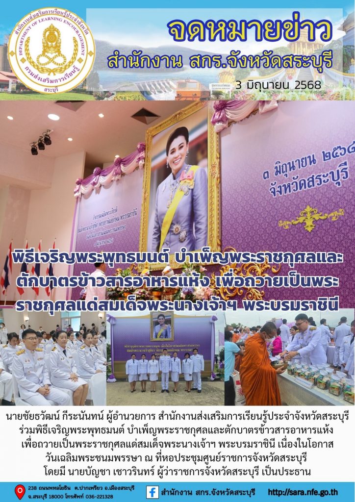 วันที่ 3 มิถุนายน 2568 นายชัยธวัฒน์ กีระนันทน์ ผู้อำนวยการ สำนักงานส่งเสริมการเรียนรู้ประจำจังหวัดสระบุรี พร้อมเจ้าหน้าที่ สำนักงานส่งเสริมการเรียนรู้ประจำจังหวัดสระบุรี ร่วมพิธีเจริญพระพุทธมนต์ บำเพ็ญพระราชกุศลและตักบาตรข้าวสารอาหารแห้ง เพื่อถวายเป็นพระราชกุศลแด่สมเด็จพระนางเจ้าฯ พระบรมราชินี เนื่องในโอกาสวันเฉลิมพระชนมพรรษา ณ ที่หอประชุมศูนย์ราชการจังหวัดสระบุรี โดยมี นายบัญชา เชาวรินทร์ ผู้ว่าราชการจังหวัดสระบุรี เป็นประธาน