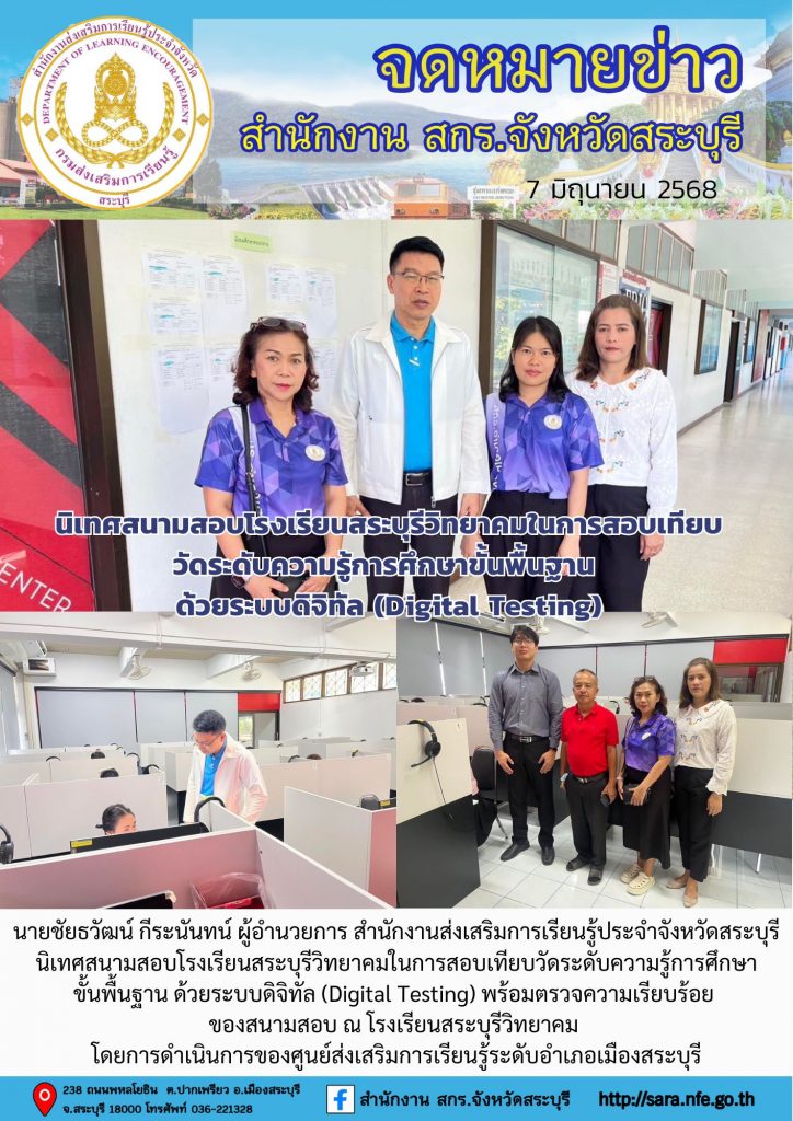 วันที่ 7 มิถุนายน 2568 นายชัยธวัฒน์ กีระนันทน์ ผู้อำนวยการ สำนักงานส่งเสริมการเรียนรู้ประจำจังหวัดสระบุรี นิเทศสนามสอบโรงเรียนสระบุรีวิทยาคมในการสอบเทียบวัดระดับความรู้การศึกษาขั้นพื้นฐาน ด้วยระบบดิจิทัล (Digital Testing) พร้อมตรวจความเรียบร้อย ของสนามสอบ ณ โรงเรียนสระบุรีวิทยาคม โดยการดำเนินการของศูนย์ส่งเสริมการเรียนรู้ระดับอำเภอเมืองสระบุรี