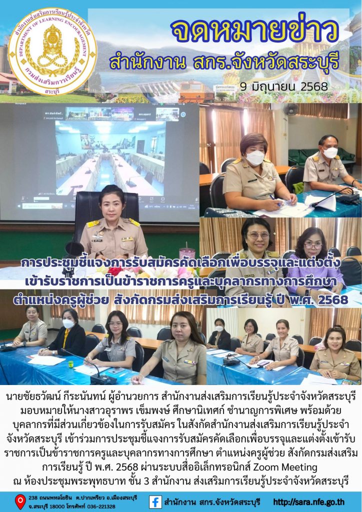 วันที่ 9 มิถุนายน 2568 นายชัยธวัฒน์ กีระนันทน์ ผู้อำนวยการ สำนักงานส่งเสริมการเรียนรู้ประจำจังหวัดสระบุรี มอบหมายให้นางสาวอุราพร เข็มพงษ์ ศึกษานิเทศก์ ชำนาญการพิเศษ พร้อมด้วยบุคลากรที่มีส่วนเกี่ยวข้องในการรับสมัคร ในสังกัดสำนักงานส่งเสริมการเรียนรู้ประจำจังหวัดสระบุรี เข้าร่วมการประชุมชี้แจงการรับสมัครคัดเลือกเพื่อบรรจุและแต่งตั้งเข้ารับราชการเป็นข้าราชการครูและบุคลากรทางการศึกษา ตำแหน่งครูผู้ช่วย สังกัดกรมส่งเสริมการเรียนรู้ ปี พ.ศ. 2568 ผ่านระบบสื่ออิเล็กทรอนิกส์ Zoom Meeting ณ ห้องประชุมพระพุทธบาท ชั้น 3 สำนักงาน ส่งเสริมการเรียนรู้ประจำจังหวัดสระบุรี