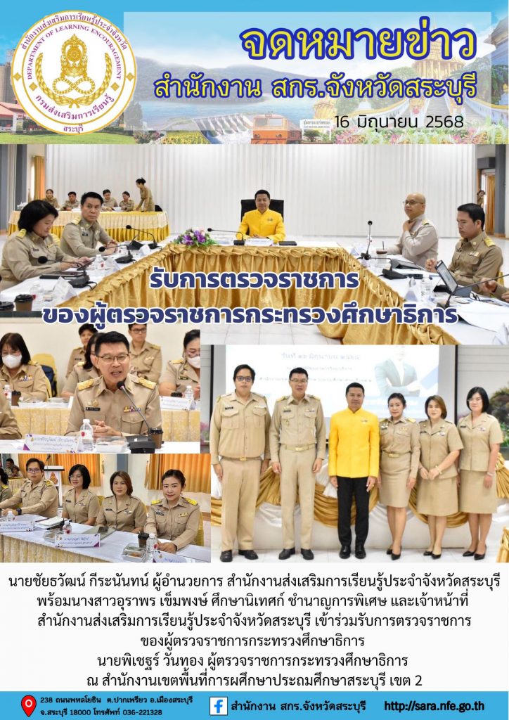 วันที่ 16 มิถุนายน 2568 นายชัยธวัฒน์ กีระนันทน์ ผู้อำนวยการ สำนักงานส่งเสริมการเรียนรู้ประจำจังหวัดสระบุรี พร้อมนางสาวอุราพร เข็มพงษ์ ศึกษานิเทศก์ ชำนาญการพิเศษ และเจ้าหน้าที่ สำนักงานส่งเสริมการเรียนรู้ประจำจังหวัดสระบุรี เข้าร่วมรับการตรวจราชการของผู้ตรวจราชการกระทรวงศึกษาธิการ นายพิเชฐร์ วันทอง ผู้ตรวจราชการกระทรวงศึกษาธิการ ณ สำนักงานเขตพื้นที่การผศึกษาประถมศึกษาสระบุรี เขต 2