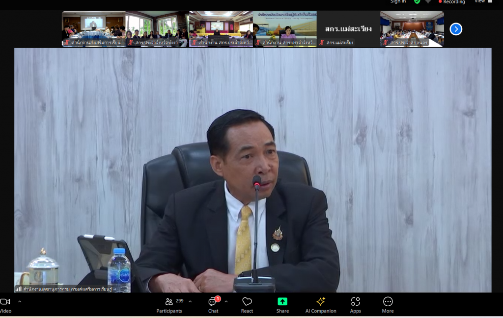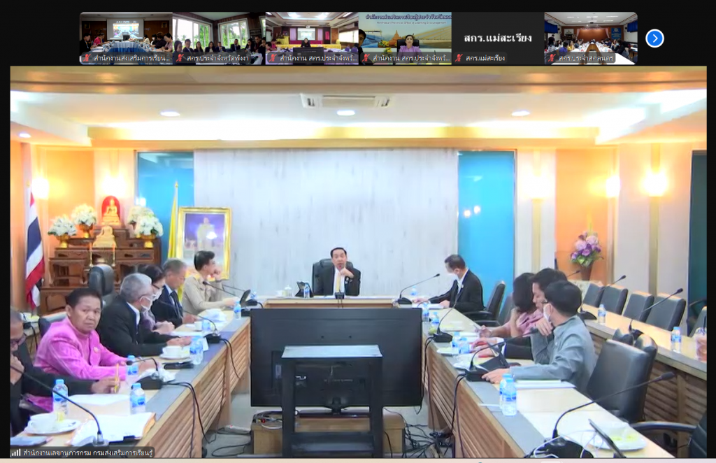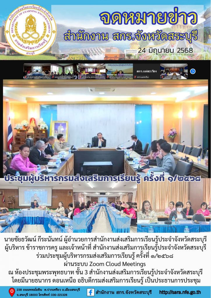 วันที่ 24 มิถุนายน 2568 นายชัยธวัฒน์ กีระนันทน์ ผู้อำนวยการสำนักงานส่งเสริมการเรียนรู้ประจำจังหวัดสระบุรี ผู้บริหาร ข้าราชการครู และเจ้าหน้าที่ สำนักงานส่งเสริมการเรียนรู้ประจำจังหวัดสระบุรี ร่วมประชุมผู้บริหารกรมส่งเสริมการเรียนรู้ ครั้งที่ ๑/๒๕๖๘ ผ่านระบบ Zoom Cloud Meetings ณ ห้องประชุมพระพุทธบาท ชั้น 3 สำนักงานส่งเสริมการเรียนรู้ประจำจังหวัดสระบุรี ในการร่วมประชุมติดตามการขับเคลื่อนงานต่างๆ เพื่อให้การทำงานเป็นไปด้วยความเรียบร้อย เเละมีประสิทธิภาพ โดยมีนายธนากร ดอนเหนือ อธิบดีกรมส่งเสริมการเรียนรู้ เป็นประธานการประชุม