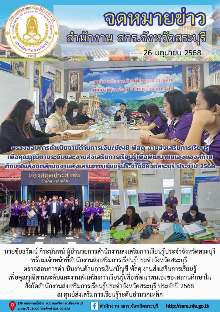 ตรวจสอบการดำเนินงานด้านการเงิน/บัญชี พัสดุ งานส่งเสริมการเรียนรู้เพื่อคุณวุฒิตามระดับและงานส่งเสริมการเรียนรู้เพื่อพัฒนาตนเองของสถานศึกษาในสังกัดสำนักงานส่งเสริมการเรียนรู้ประจำจังหวัดสระบุรี ประจำปี 2568
