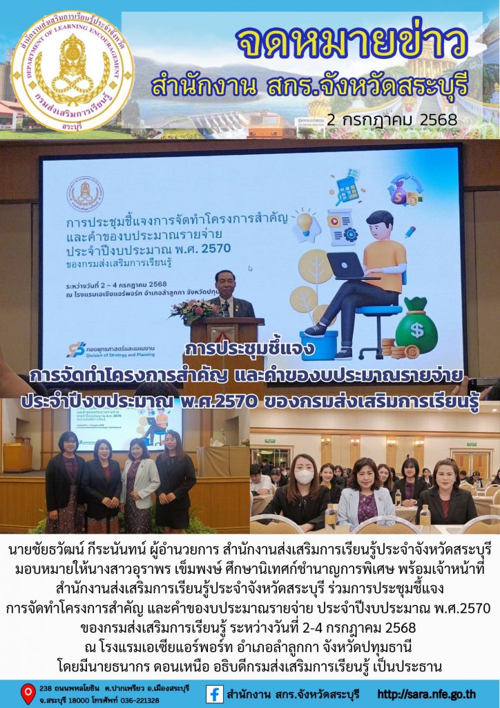 นายชัยธวัฒน์ กีระนันทน์ ผู้อำนวยการ สำนักงานส่งเสริมการเรียนรู้ประจำจังหวัดสระบุรี มอบหมายให้นางสาวอุราพร เข็มพงษ์ ศึกษานิเทศก์ชำนาญการพิเศษ พร้อมเจ้าหน้าที่ สำนักงานส่งเสริมการเรียนรู้ประจำจังหวัดสระบุรี ร่วมการประชุมชึ้แจงการจัดทำโครงการสำคัญ และคำของบประมาณรายจ่าย ประจำปีงบประมาณ พ.ศ.2570 ของกรมส่งเสริมการเรียนรู้ ระหว่างวันที่ 2-4 กรกฎาคม 2568 ณ โรงแรมเอเซียแอร์พอร์ท อำเภอลำลูกกา จังหวัดปทุมธานี โดยมีนายธนากร ดอนเหนือ อธิบดีกรมส่งเสริมการเรียนรู้ เป็นประธานในพิธีเปิดการประชุม