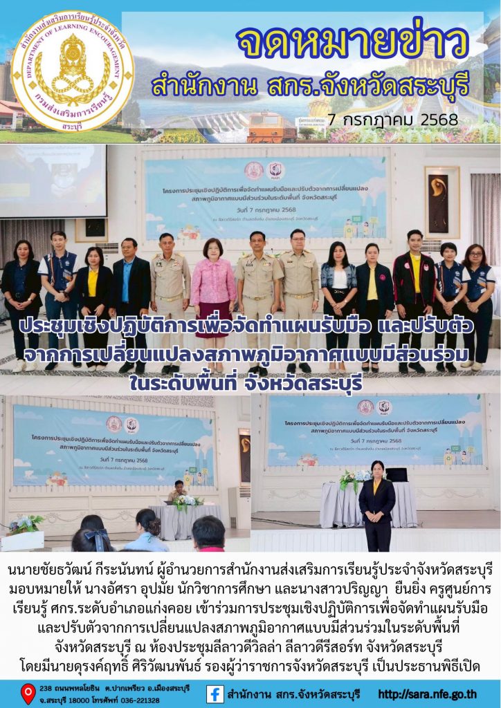 วันจันทร์ที่ 7 กรกฎาคม 2568 นายชัยธวัฒน์ กีระนันทน์ ผู้อำนวยการสำนักงานส่งเสริมการเรียนรู้ประจำจังหวัดสระบุรี มอบหมายให้ นางอัศรา อุปมัย นักวิชาการศึกษา และนางสาวปริญญา ยืนยิ่ง ครูศูนย์การเรียนรู้ ศกร.ระดับอำเภอแก่งคอย เข้าร่วมการประชุมเชิงปฏิบัติการเพื่อจัดทำแผนรับมือและปรับตัวจากการเปลี่ยนแปลงสภาพภูมิอากาศแบบมีส่วนร่วมในระดับพื้นที่ จังหวัดสระบุรี ณ ห้องประชุมลีลาวดีวิลล่า ลีลาวดีรีสอร์ท ตำบลตลิ่งชัน อำเภอเมืองสระบุรี จังหวัดสระบุรี โดยมีนายดุรงค์ฤทธิ์ ศิริวัฒนพันธ์ รองผู้ว่าราชการจังหวัดสระบุรี เป็นประธานพิธีเปิด