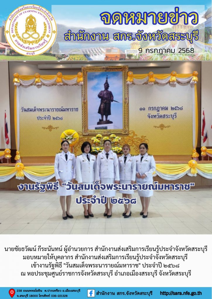 วันที่ 9 กรกฎาคม 2568 นายชัยธวัฒน์ กีระนันทน์ ผู้อำนวยการ สำนักงานส่งเสริมการเรียนรู้ประจำจังหวัดสระบุรี มอบหมายให้บุคลากร สำนักงานส่งเสริมการเรียนรู้ประจำจังหวัดสระบุรี เข้างานรัฐพิธี “วันสมเด็จพระนารายณ์มหาราช” ประจำปี ๒๕๖๘ ในวันที่ ๙ กรกฎาคม ๒๕๖๘ ณ หอประชุมศูนย์ราชการจังหวัดสระบุรี อำเภอเมืองสระบุรี จังหวัดสระบุรี