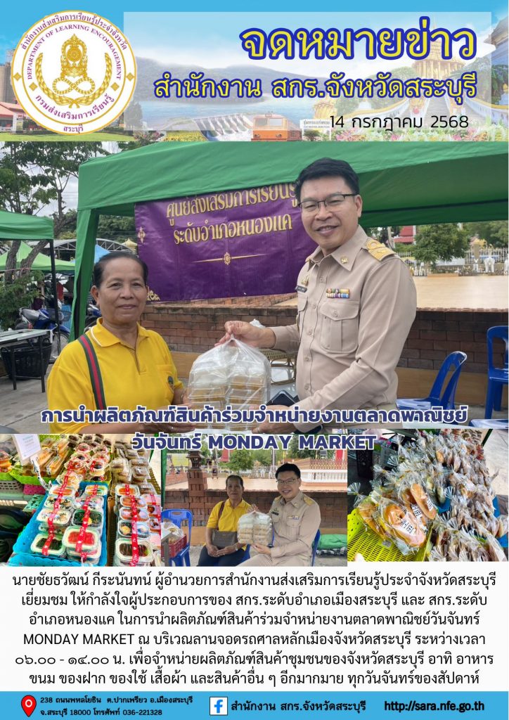วันจันทร์ที่ ๑๔ กรกฎาคม ๒๕๖๘ นายชัยธวัฒน์ กีระนันทน์ ผู้อำนวยการสำนักงานส่งเสริมการเรียนรู้ประจำจังหวัดสระบุรี เยี่ยมชม ให้กำลังใจผู้ประกอบการของ สกร.ระดับอำเภอเมืองสระบุรี และ สกร.ระดับอำเภอหนองแค ในการนำผลิตภัณฑ์สินค้าร่วมจำหน่ายงานตลาดพาณิชย์วันจันทร์ MONDAY MARKET ณ บริเวณลานจอดรถศาลหลักเมืองจังหวัดสระบุรี ระหว่างเวลา ๐๖.๐๐ – ๑๔.๐๐ น. เพื่อจำหน่ายผลิตภัณฑ์สินค้าชุมชนของจังหวัดสระบุรี อาทิ อาหาร ขนม ของฝาก ของใช้ เสื้อผ้า และสินค้าอื่น ๆ อีกมากมาย ทุกวันจันทร์ของสัปดาห์