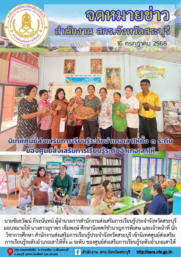 วันที่ ๑๖ กรกฎาคม ๒๕๖๘ นายชัยธวัฒน์ กีระนันทน์ ผู้อำนวยการสำนักงานส่งเสริมการเรียนรู้ประจำจังหวัดสระบุรี มอบหมายให้ นางสาวอุราพร เข็มพงษ์ ศึกษานิเทศก์ชำนาญการพิเศษ และเจ้าหน้าที่ นักวิชาการศึกษา สำนักงานส่งเสริมการเรียนรู้ประจำจังหวัดสระบุรี เข้านิเทศศูนย์ส่งเสริมการเรียนรู้ระดับอำเภอเสาไห้ทั้ง ๓ ระดับ ของศูนย์ส่งเสริมการเรียนรู้ระดับอำเภอเสาไห้