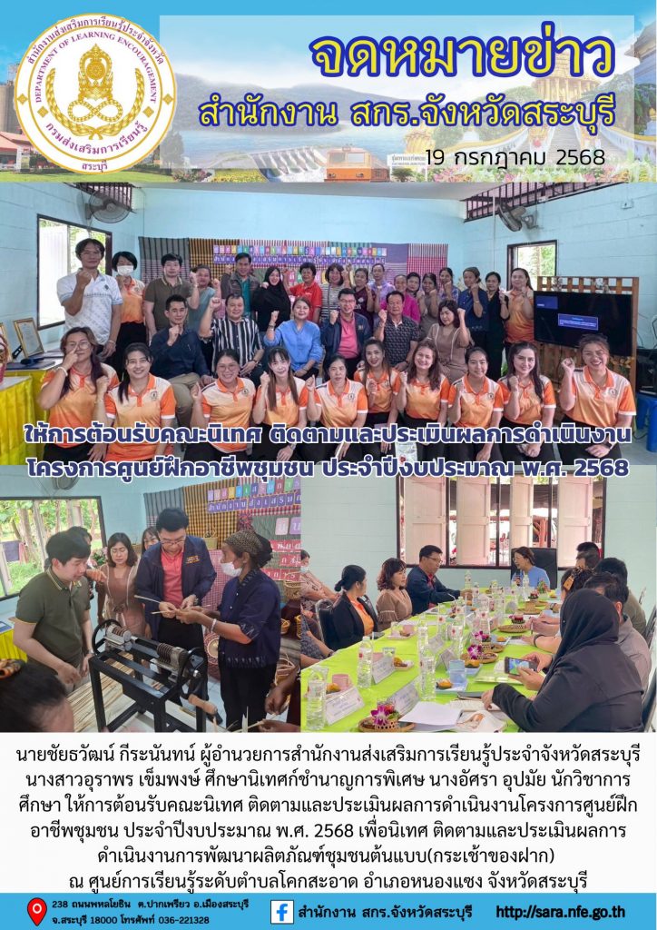 วันเสาร์ที่ 19 กรกฎาคม 2568 นายชัยธวัฒน์ กีระนันทน์ ผู้อำนวยการสำนักงานส่งเสริมการเรียนรู้ประจำจังหวัดสระบุรี นางสาวอุราพร เข็มพงษ์ ศึกษานิเทศก์ชำนาญการพิเศษ นางอัศรา อุปมัย นักวิชาการศึกษา ให้การต้อนรับคณะนิเทศ ติดตามและประเมินผลการดำเนินงานโครงการศูนย์ฝึกอาชีพชุมชน ประจำปีงบประมาณ พ.ศ. 2568 เพื่อนิเทศ ติดตามและประเมินผลการดำเนินงานการพัฒนาผลิตภัณฑ์ชุมชนต้นแบบ(กระเช้าของฝาก) ณ ศูนย์การเรียนรู้ระดับตำบลโคกสะอาด อำเภอหนองแซง จังหวัดสระบุรี