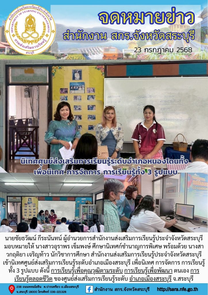 วันพุธที่ 23 กรกฎาคม 2567 นายชัยธวัฒน์ กีระนันทน์ ผู้อำนวยการสำนักงานส่งเสริมการเรียนรู้ประจำจังหวัดสระบุรี มอบหมายให้ นางสาวอุราพร เข็มพงษ์ ศึกษานิเทศก์ชำนาญการพิเศษ พร้อมด้วย นางสาวกฤติยา เจริญท้าว นักวิชาการศึกษา สำนักงานส่งเสริมการเรียนรู้ประจำจังหวัดสระบุรี เข้านิเทศศูนย์ส่งเสริมการเรียนรู้ระดับอำเภอเมืองสระบุรี เพื่อนิเทศ การจัดการ การเรียนรู้ทั้ง 3 รูปแบบ ดังนี้
