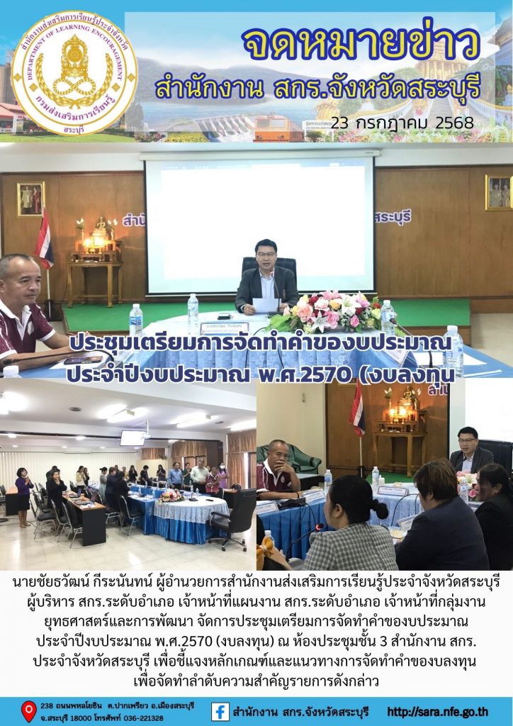 วันที่ 23 กรกฏาคม 2568 นายชัยธวัฒน์ กีระนันทน์ ผู้อำนวยการสำนักงานส่งเสริมการเรียนรู้ประจำจังหวัดสระบุรี ผู้บริหาร สกร.ระดับอำเภอ เจ้าหน้าที่แผนงาน สกร.ระดับอำเภอ เจ้าหน้าที่กลุ่มงานยุทธศาสตร์และการพัฒนา จัดการประชุมเตรียมการจัดทำคำของบประมาณประจำปีงบประมาณ พ.ศ.2570 (งบลงทุน) ณ ห้องประชุมชั้น 3 สำนักงาน สกร.ประจำจังหวัดสระบุรี เพื่อชี้แจงหลักเกณฑ์และแนวทางการจัดทำคำของบลงทุน เพื่อจัดทำลำดับความสำคัญรายการดังกล่าว