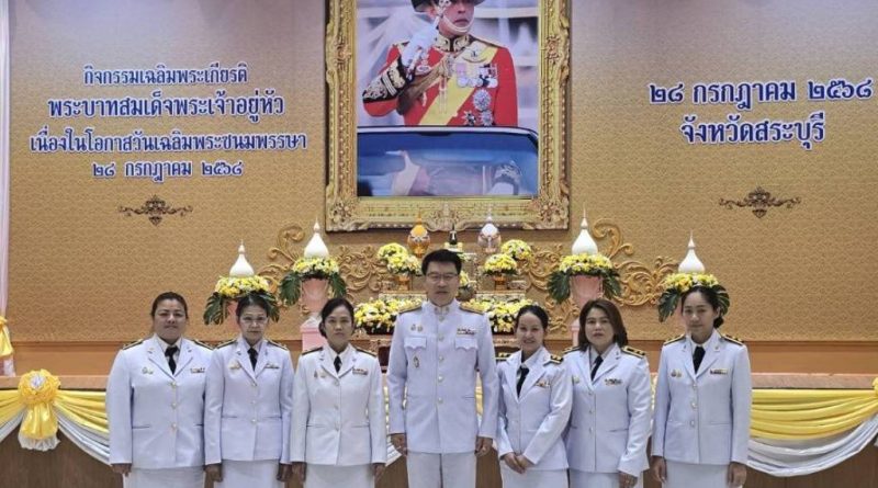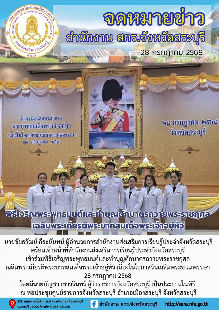 วันที่ 28 กรกฏาคม 2568 เวลา 07.00 น. นายบัญชา เชาวรินทร์ ผู้ว่าราชการจังหวัดสระบุรี เป็นประธานในพิธีเจริญพระพุทธมนต์และทำบุญตักบาตรถวายพระราชกุศล เฉลิมพระเกียรติพระบาทสมเด็จพระเจ้าอยู่หัว เนื่องในโอกาสวันเฉลิมพระชนมพรรษา 28 กรกฏาคม 2568 โดยนายชัยธวัฒน์ กีระนันทน์ ผู้อำนวยการสำนักงานส่งเสริมการเรียนรู้ประจำจังหวัดสระบุรี พร้อมเจ้าหน้าที่สำนักงานส่งเสริมการเรียนรู้ประจำจังหวัดสระบุรี เข้าร่วมพิธีในครั้งนี้ ณ หอประชุมศูนย์ราชการจังหวัดสระบุรี อำเภอเมืองสระบุรี จังหวัดสระบุรี