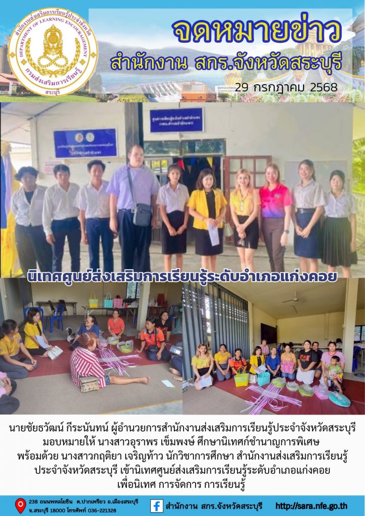 วันอังคารที่ 29 กรกฎาคม 2568 นายชัยธวัฒน์ กีระนันทน์ ผู้อำนวยการสำนักงานส่งเสริมการเรียนรู้ประจำจังหวัดสระบุรี มอบหมายให้ นางสาวอุราพร เข็มพงษ์ ศึกษานิเทศก์ชำนาญการพิเศษ พร้อมด้วย นางสาวกฤติยา เจริญท้าว นักวิชาการศึกษา สำนักงานส่งเสริมการเรียนรู้ประจำจังหวัดสระบุรี เข้านิเทศศูนย์ส่งเสริมการเรียนรู้ระดับอำเภอแก่งคอยทั้ง เพื่อนิเทศ การจัดการ การเรียนรู้ ดังนี้ การเรียนรู้เพื่อคุณวุฒิตามระดับ การเรียนรู้เพื่อพัฒนา ตนเอง ของศูนย์ส่งเสริมการเรียนรู้ระดับอำเภอเเก่งคอย จ.สระบุรี